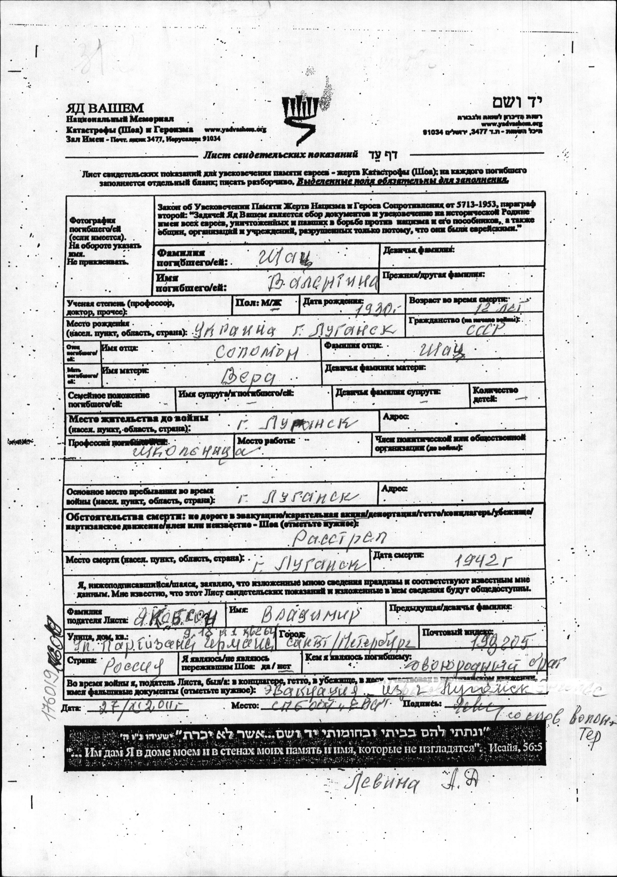 Шац Валентина 1930 Ворошиловград, Украина (СССР) Лист свидетельских показаний