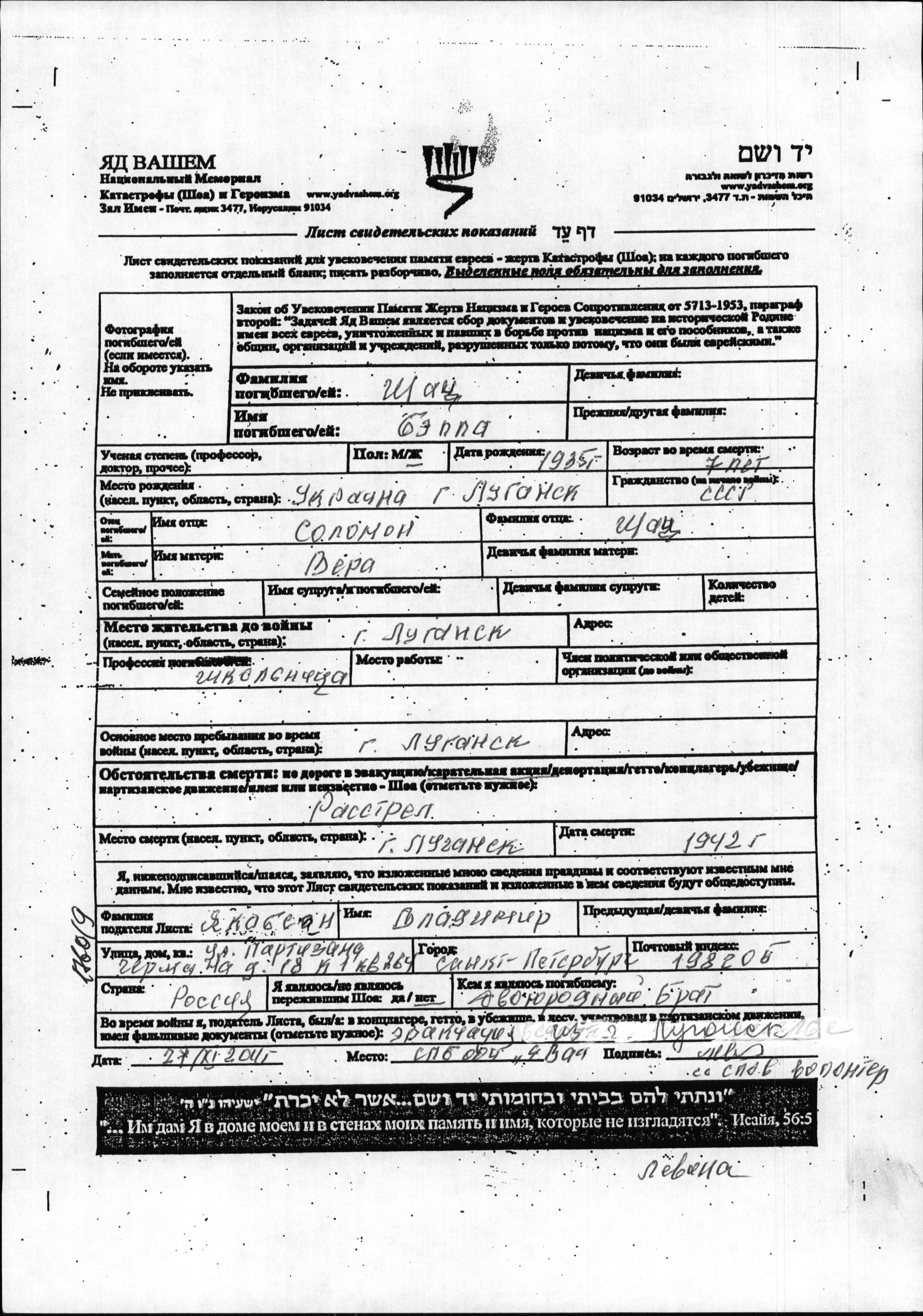 Шац Белла 1935 Ворошиловград, Украина (СССР) Лист свидетельских показаний