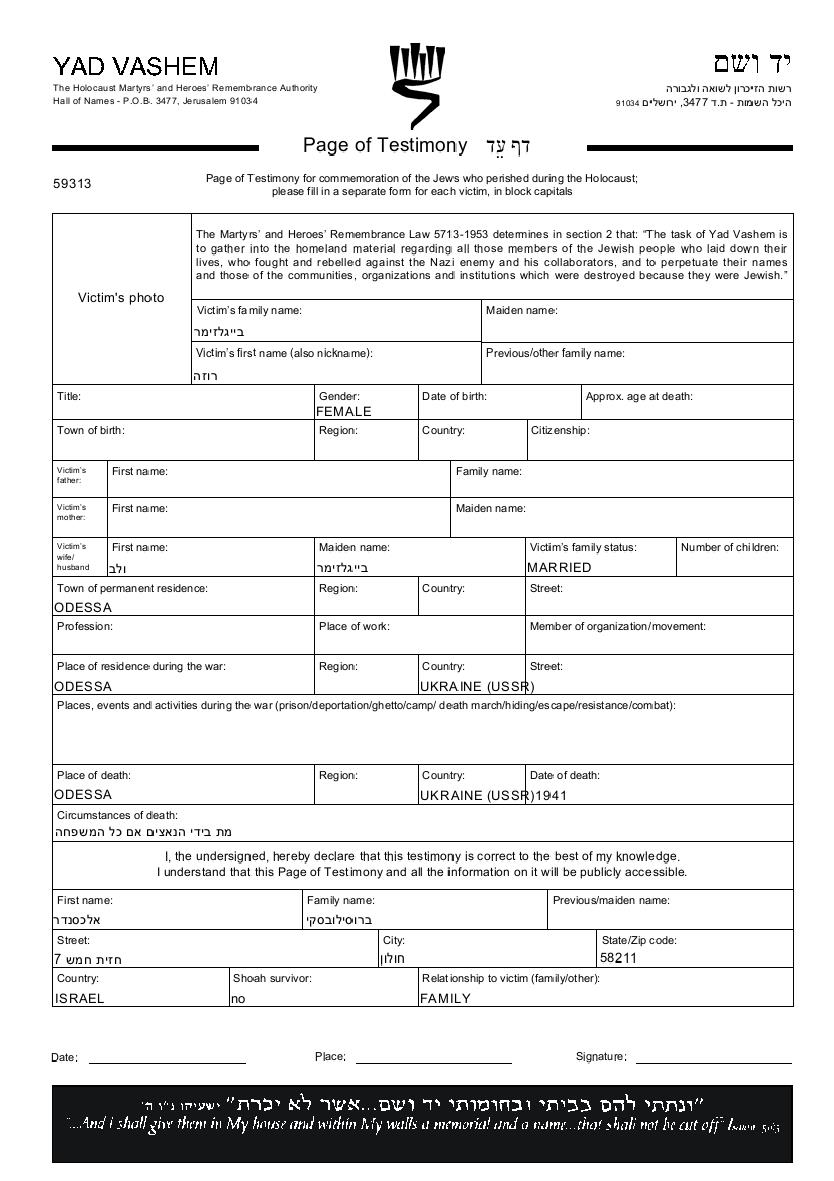 Роза Бейгельзимер. Женат / замужем. Место жительства до войны: Одесса, Украина (СССР). Место во время войны: Одесса, Украина (СССР).