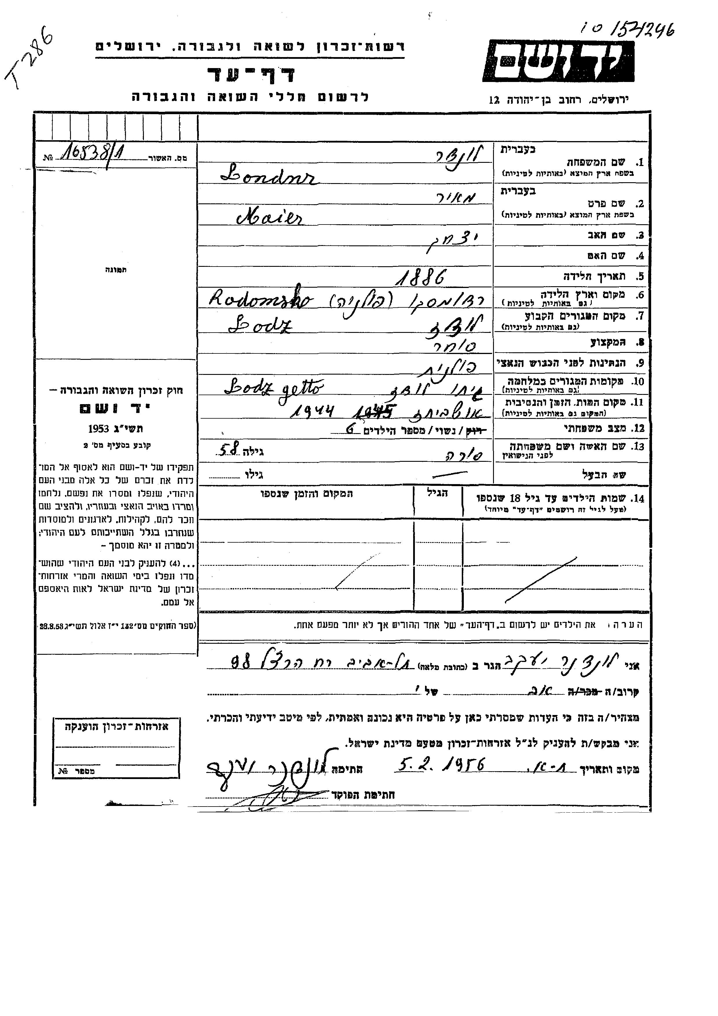 Маиер Лонднер Левендер, место рождения: Радомско, Польша. Отец: Ицхак. Торговец / торговка. Женат / замужем. Место жительства до войны: Лодзь, Польша. Место во время войны: Лодзь, Польша.