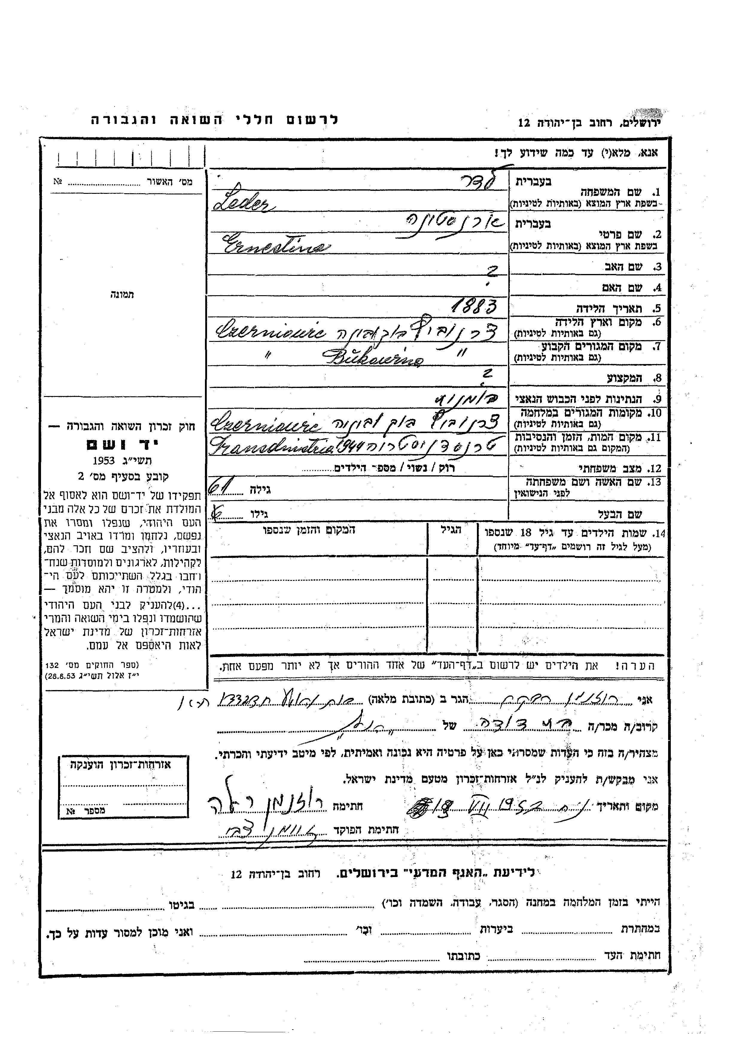 Ледер Эрнестина 1883 Черновцы, Румыния Лист свидетельских показаний