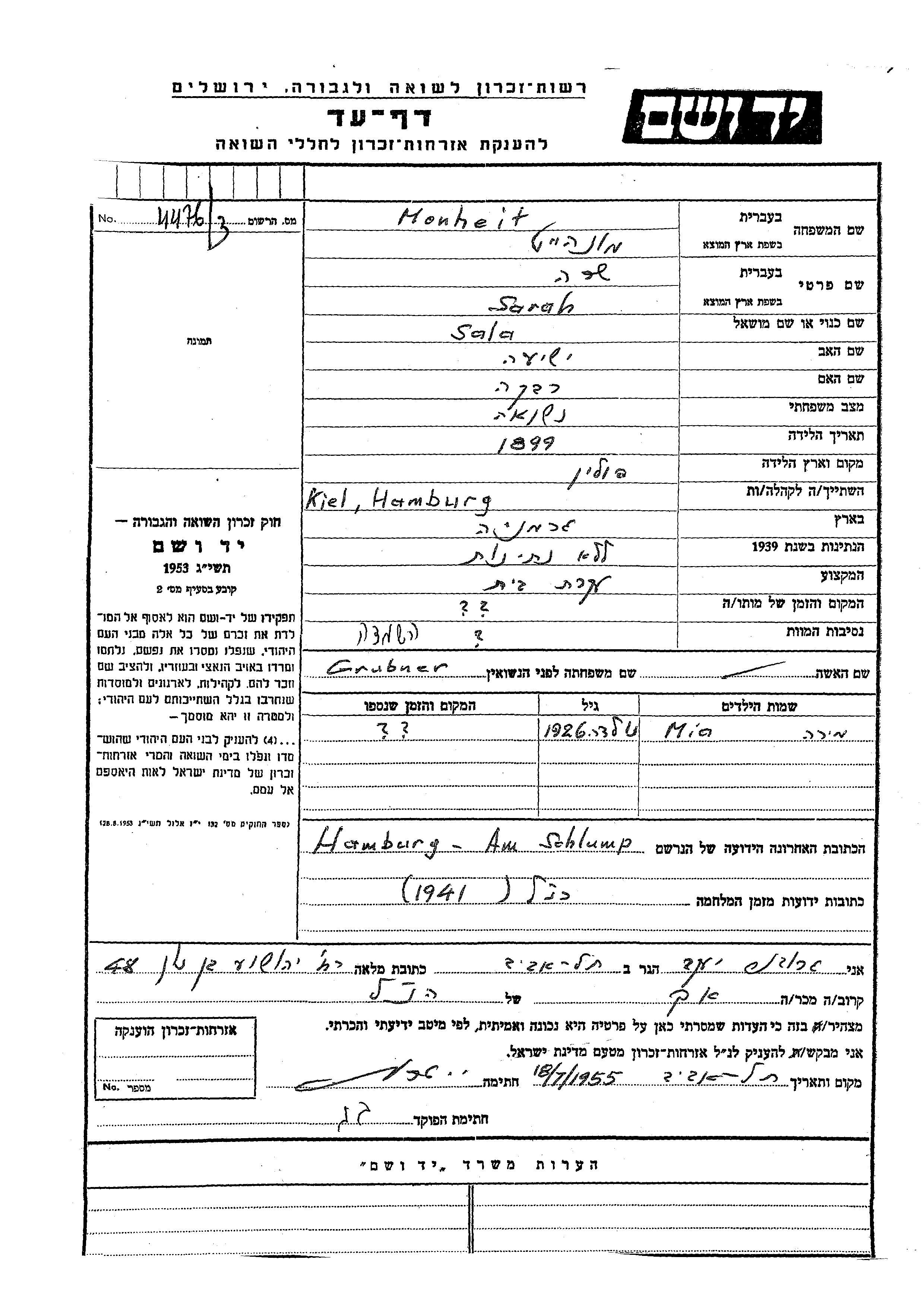Сара Монхейт, девичья фамилия Грубнер, место рождения: Польша. Отец: Иешая, mать:Ривка. Домохозяйка. Женат / замужем. Место жительства до войны: Гамбург, Германия. Место во время войны: Гамбург, Германия.