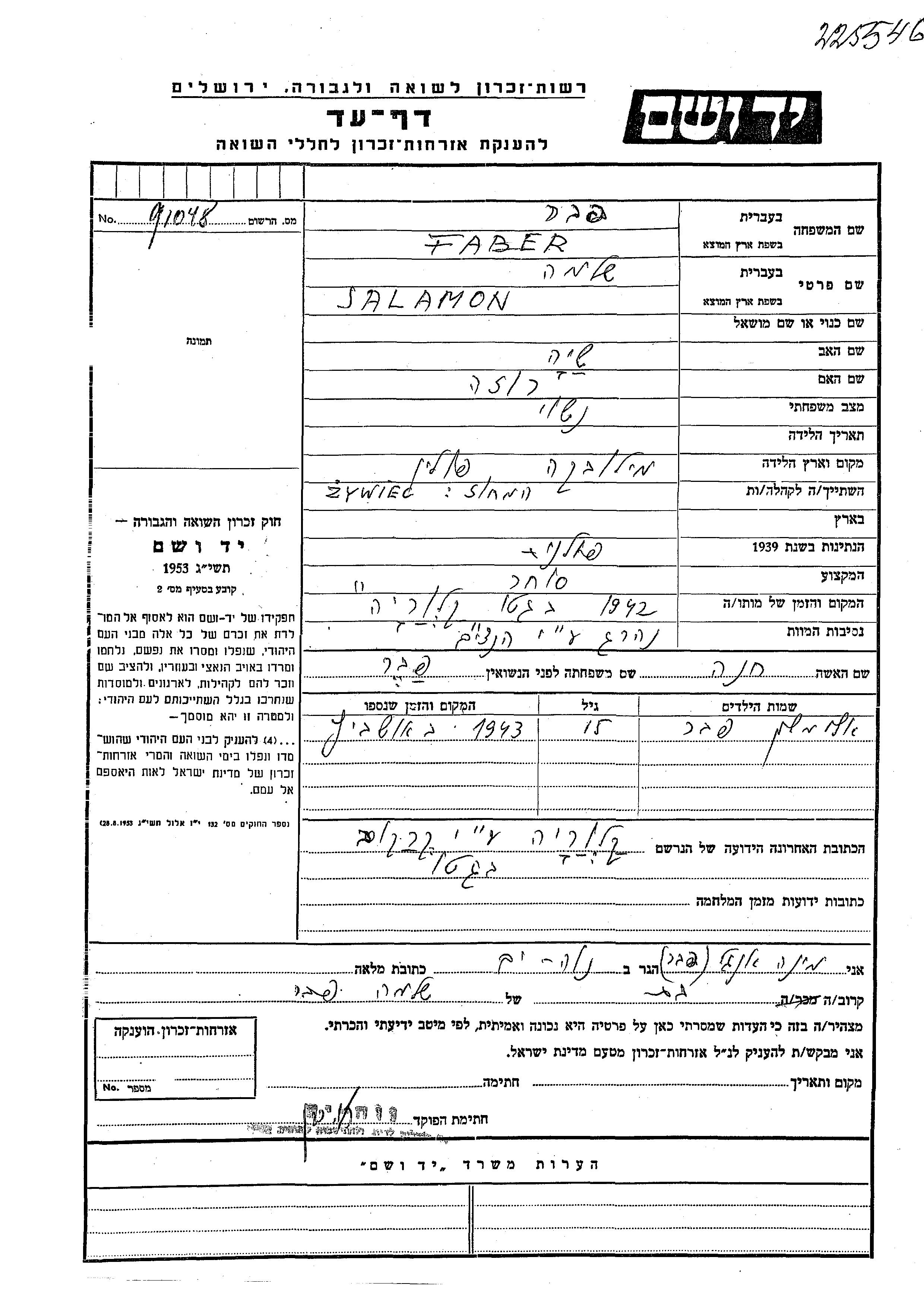 Саламон Фабер, место рождения: Милувка, Польша. Отец: Шая, mать:Роза. Торговец / торговка. Женат / замужем. Место жительства до войны: Калвария, Польша.