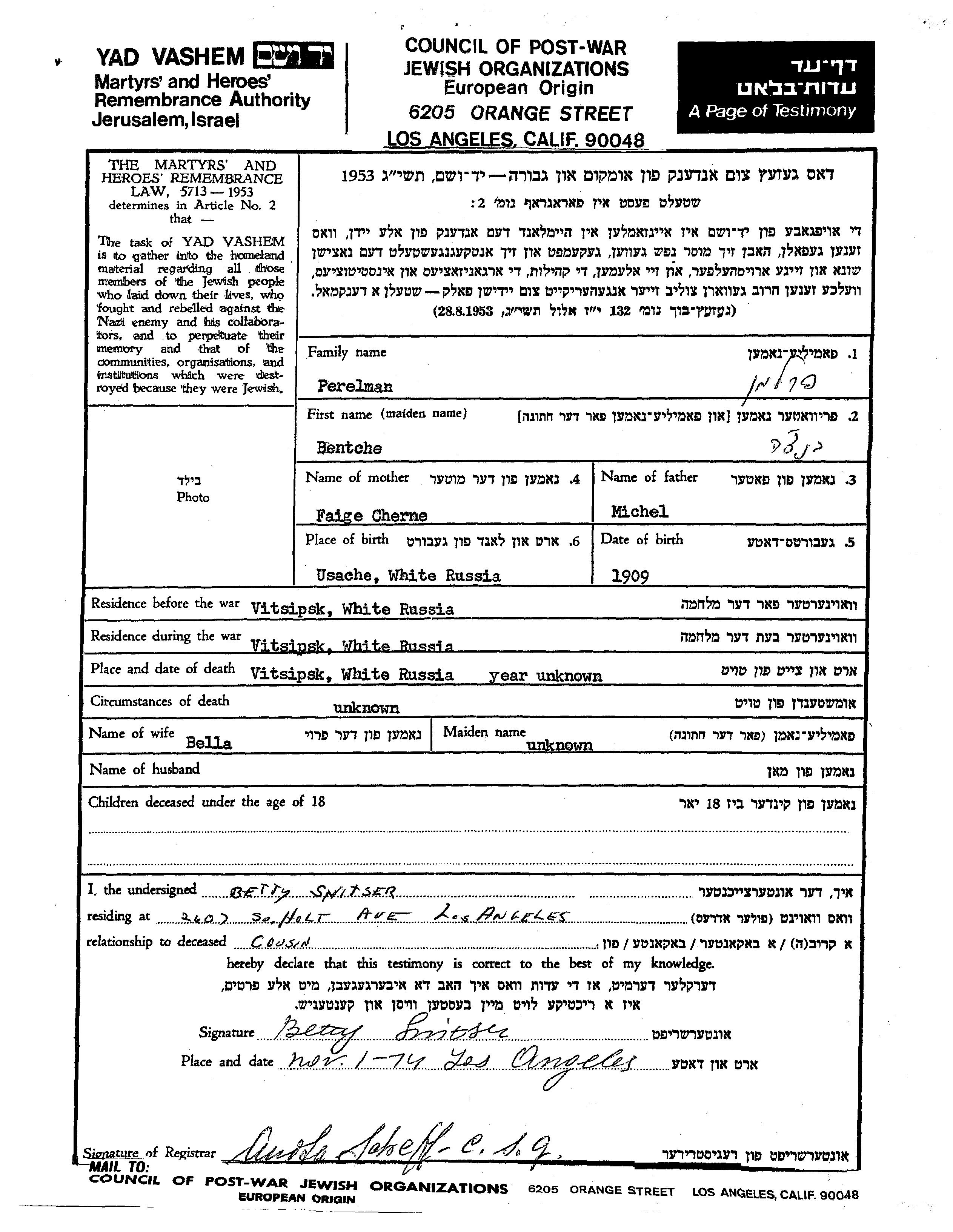 Бенче Перельман, место рождения: Ушачи, Белоруссия (СССР). Отец: Михель, mать:Файге Чарна. Женат / замужем. Место жительства до войны: Витебск, Белоруссия (СССР). Место во время войны: Витебск, Белоруссия (СССР).