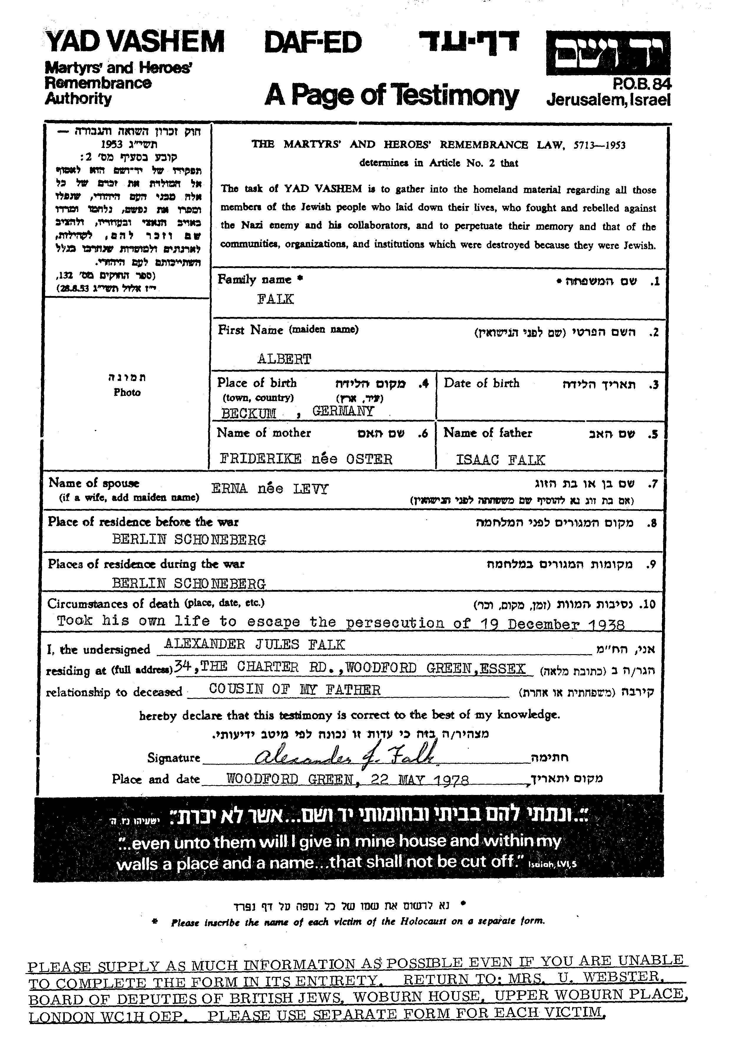 Альберт Фальк, место рождения: Беккум, Германия. Отец: Исаак, mать:Фридерике. Женат / замужем. Место жительства до войны: Берлин, Германия. Место во время войны: Берлин, Германия.