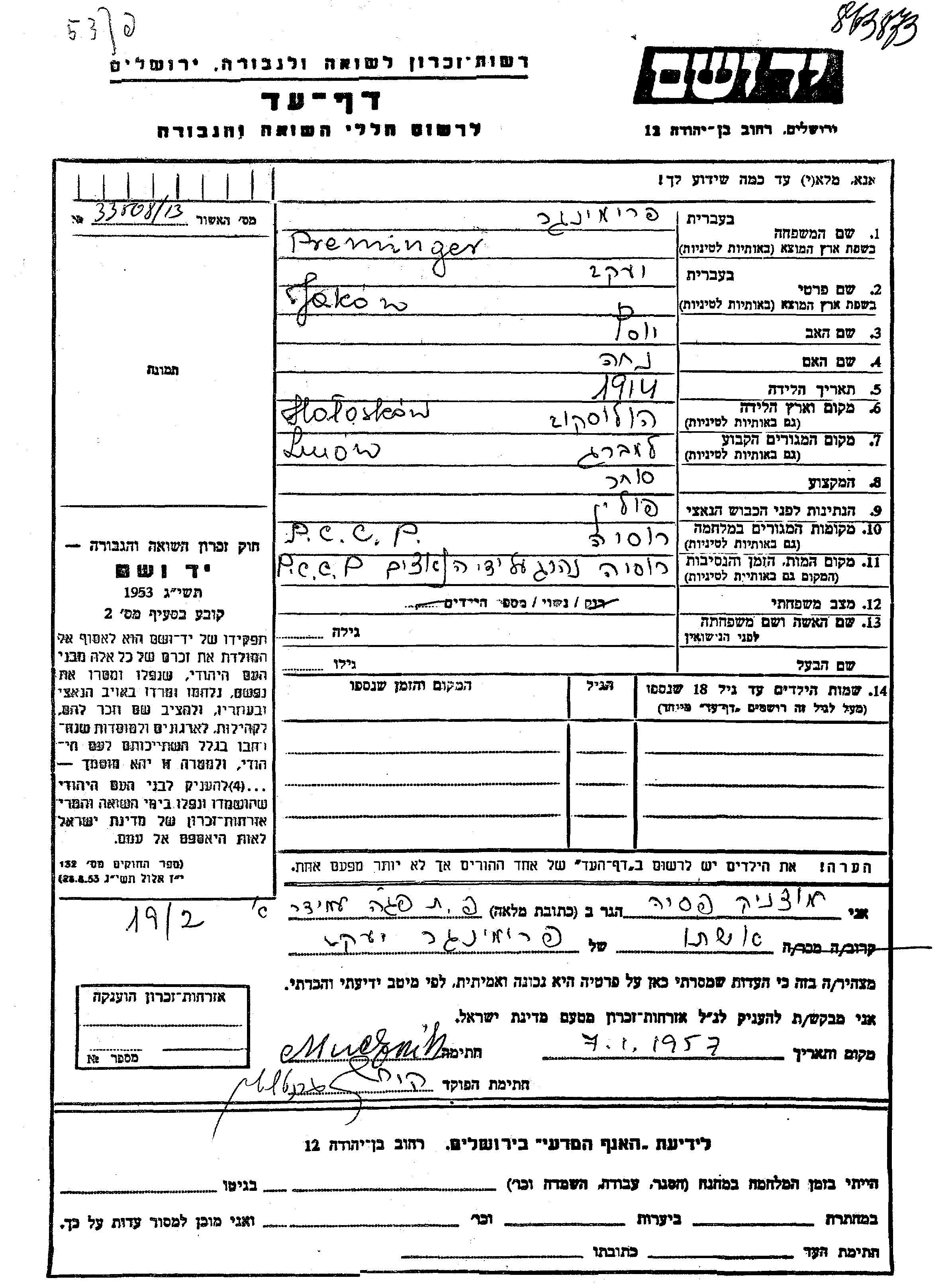 Яков Премингер, место рождения: Holoskow, Польша. Отец: Иосеф, mать:Неха. Торговец / торговка. Женат / замужем. Место жительства до войны: Львов, Польша. Место во время войны: СССР.