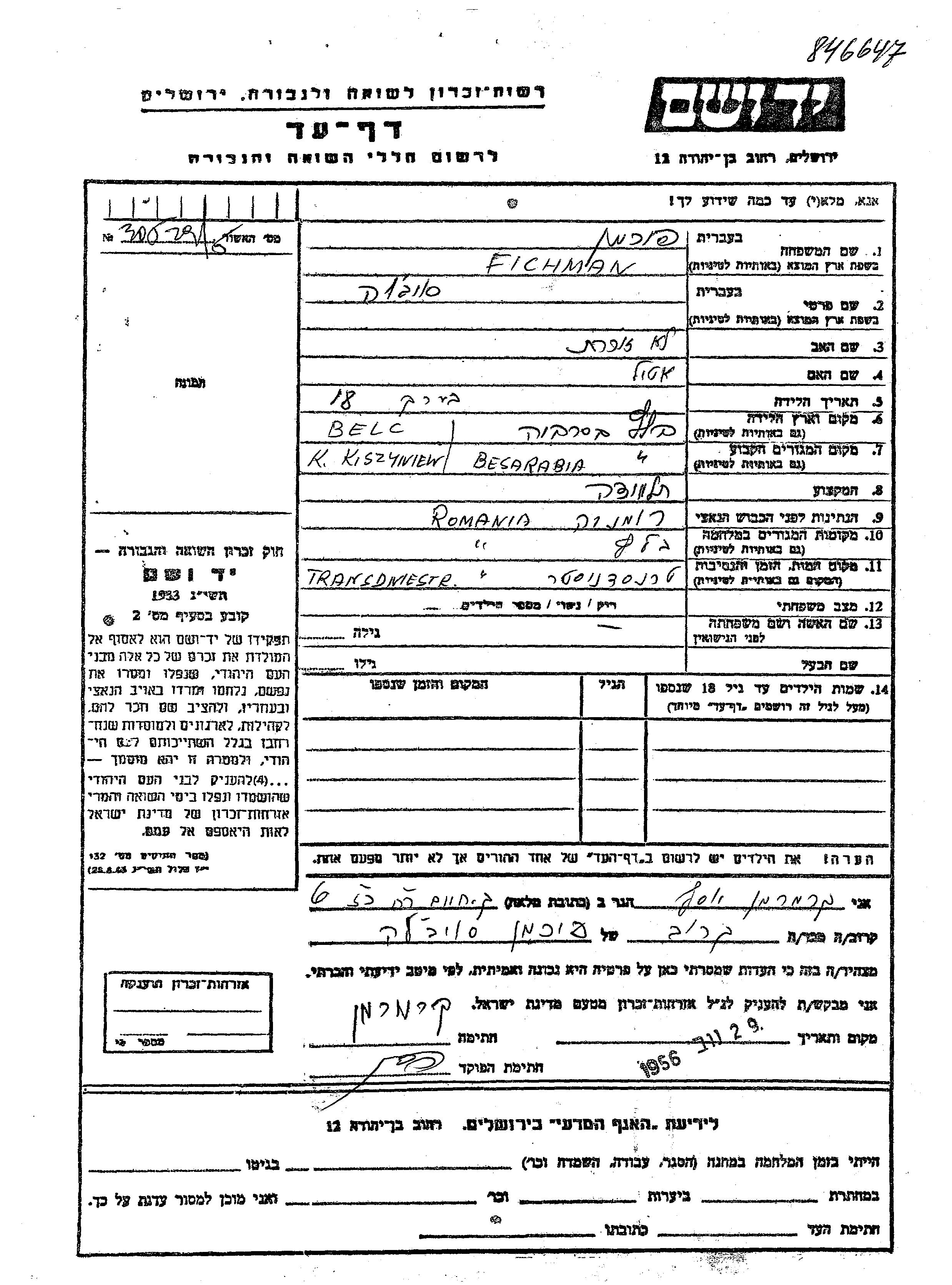 Фихман Сойбела Бельцы, Румыния Лист свидетельских показаний