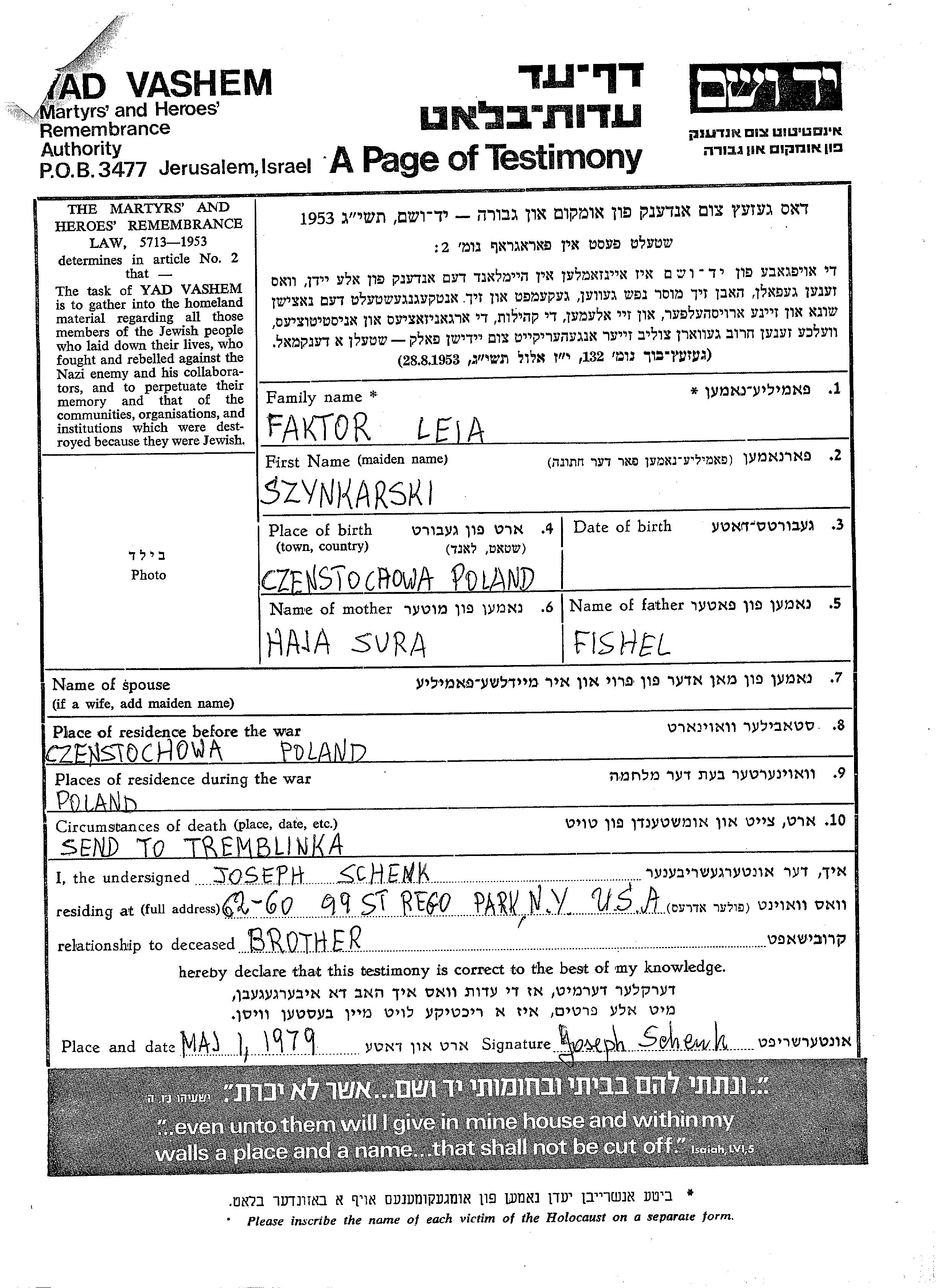 Лея Фактор, девичья фамилия Шинкарски, место рождения: Ченстохова, Польша. Отец: Фишель, mать:Хая Сура. Место жительства до войны: Ченстохова, Польша. Место во время войны: Польша.