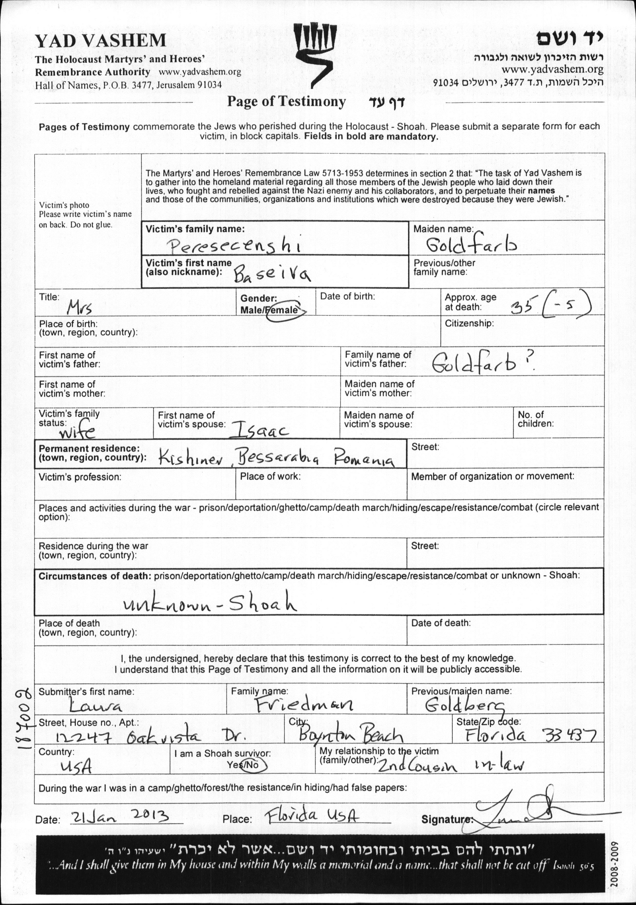 Басейва Пересеченски, девичья фамилия Гольдфарб. Женат / замужем. Место жительства до войны: Кишинёв, Румыния.