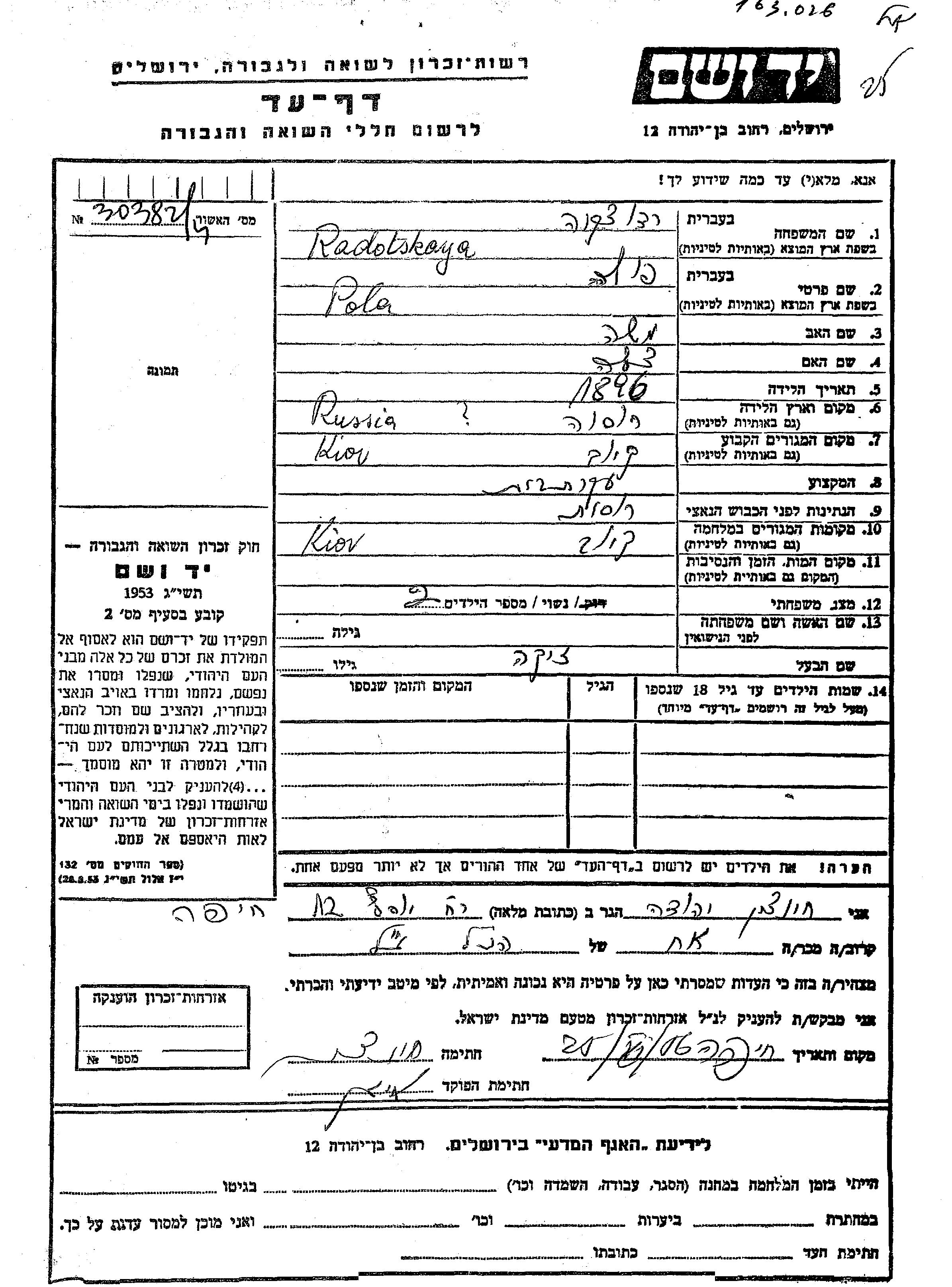 Пола Радоцкая, место рождения: Россия (СССР). Отец: Моше, mать:Цила. Домохозяйка. Женат / замужем. Место жительства до войны: Киев, Украина (СССР). Место во время войны: Киев, Украина (СССР).
