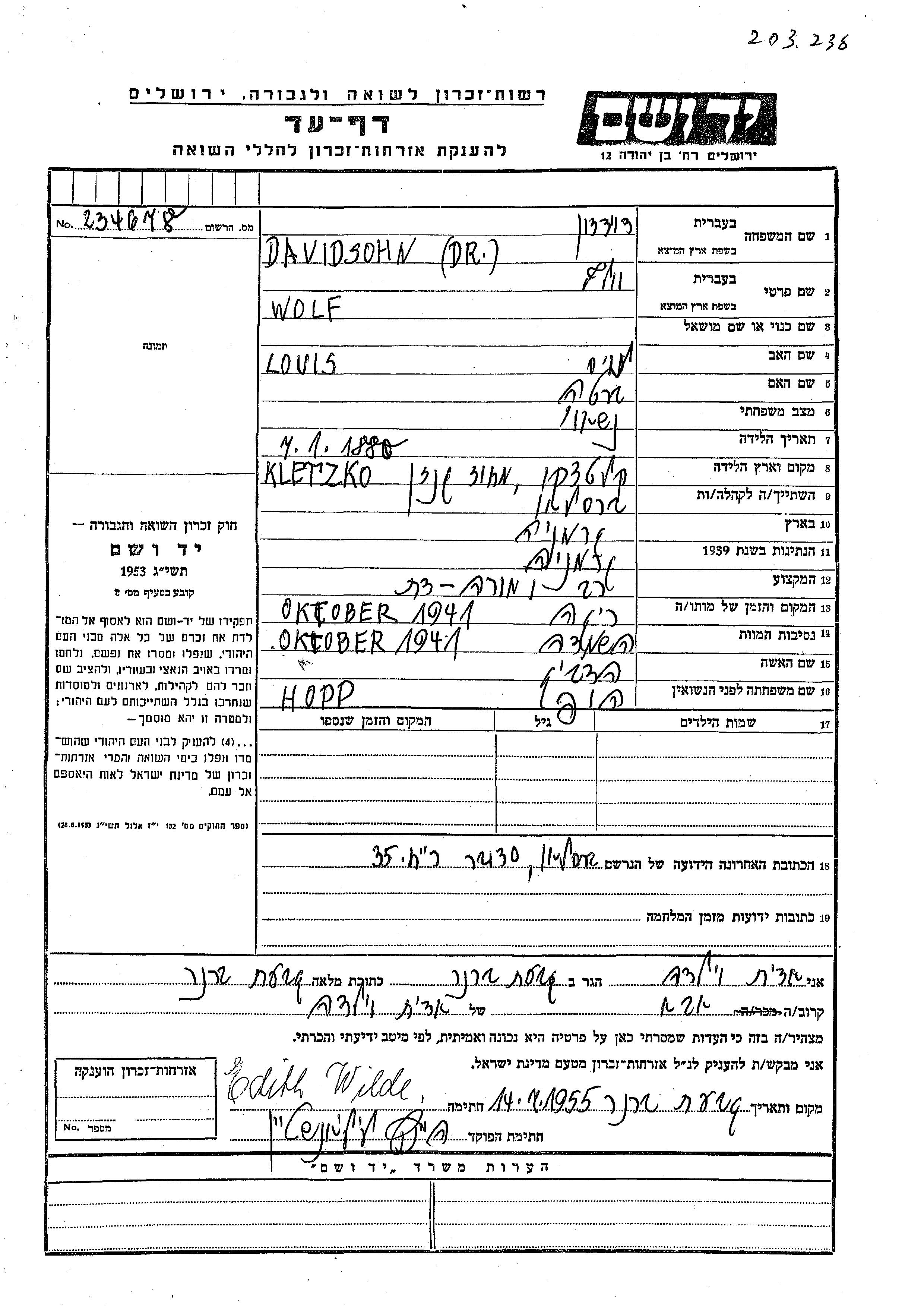Др. Вольф Давидсон, место рождения: Клецко, Польша. Отец: Луис, mать:Берта. Раввин. Женат / замужем.