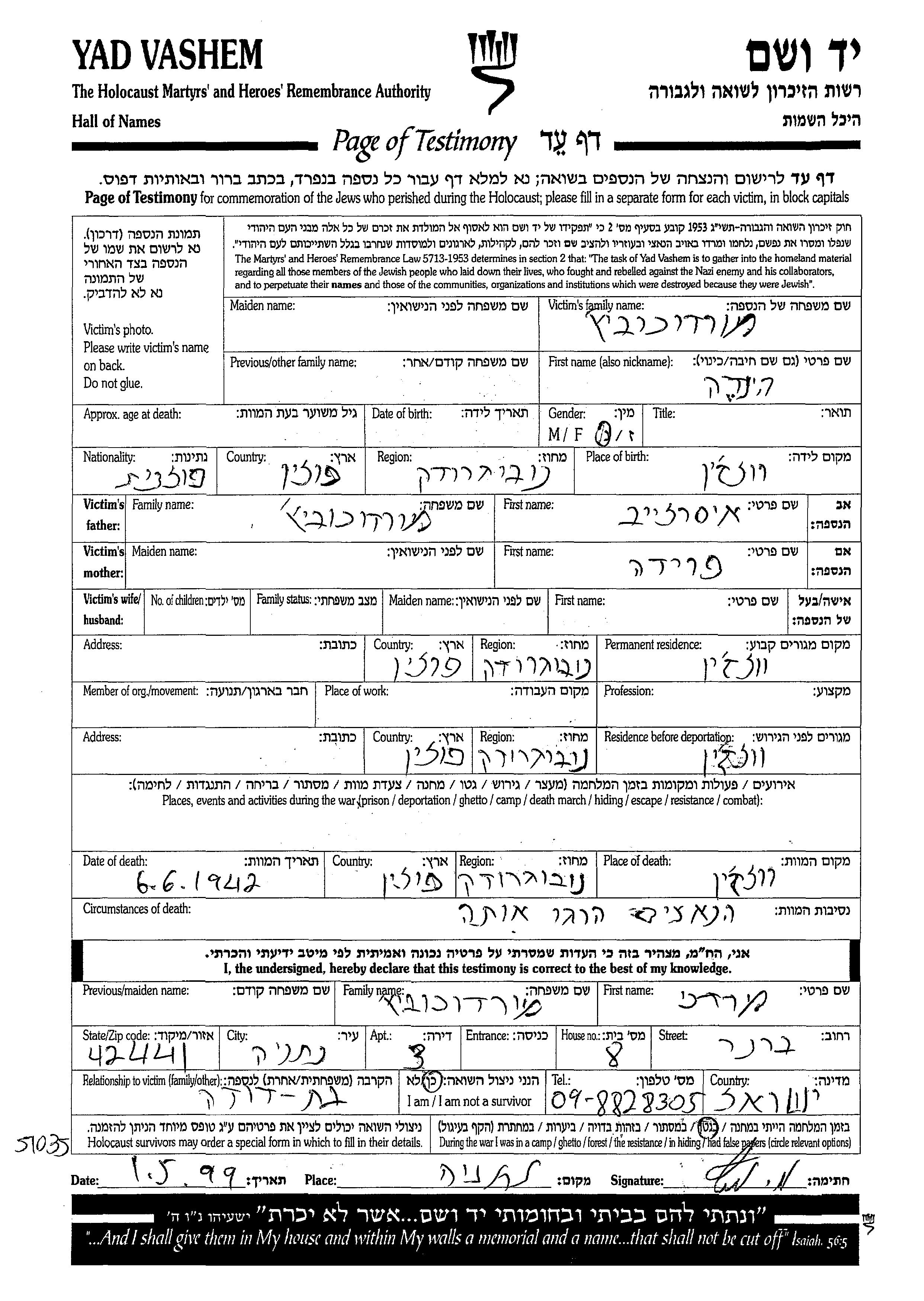 Яд Вашем - Листы свидетельских показаний Мемориального фонда