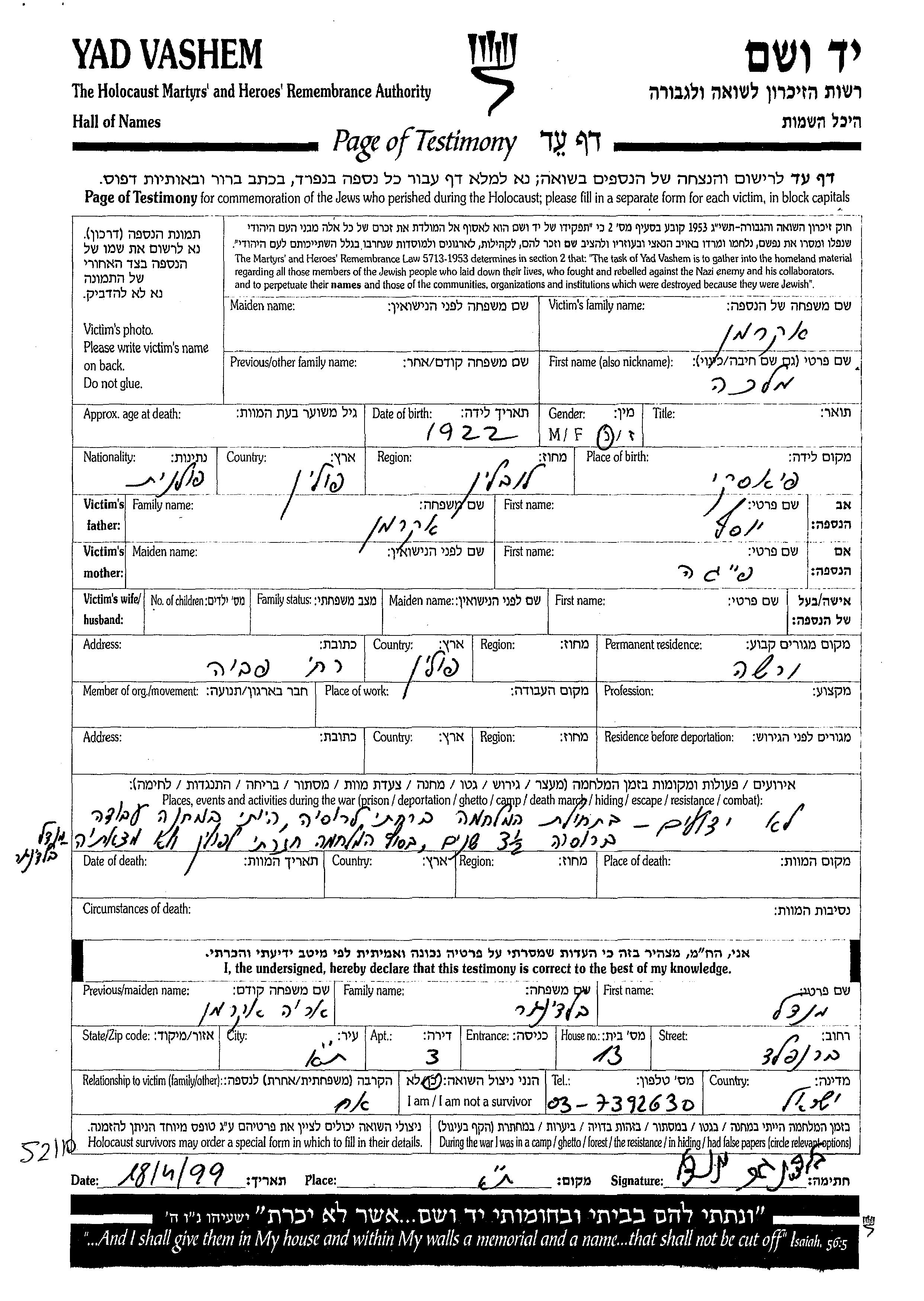 Яд Вашем - Листы свидетельских показаний Мемориального фонда