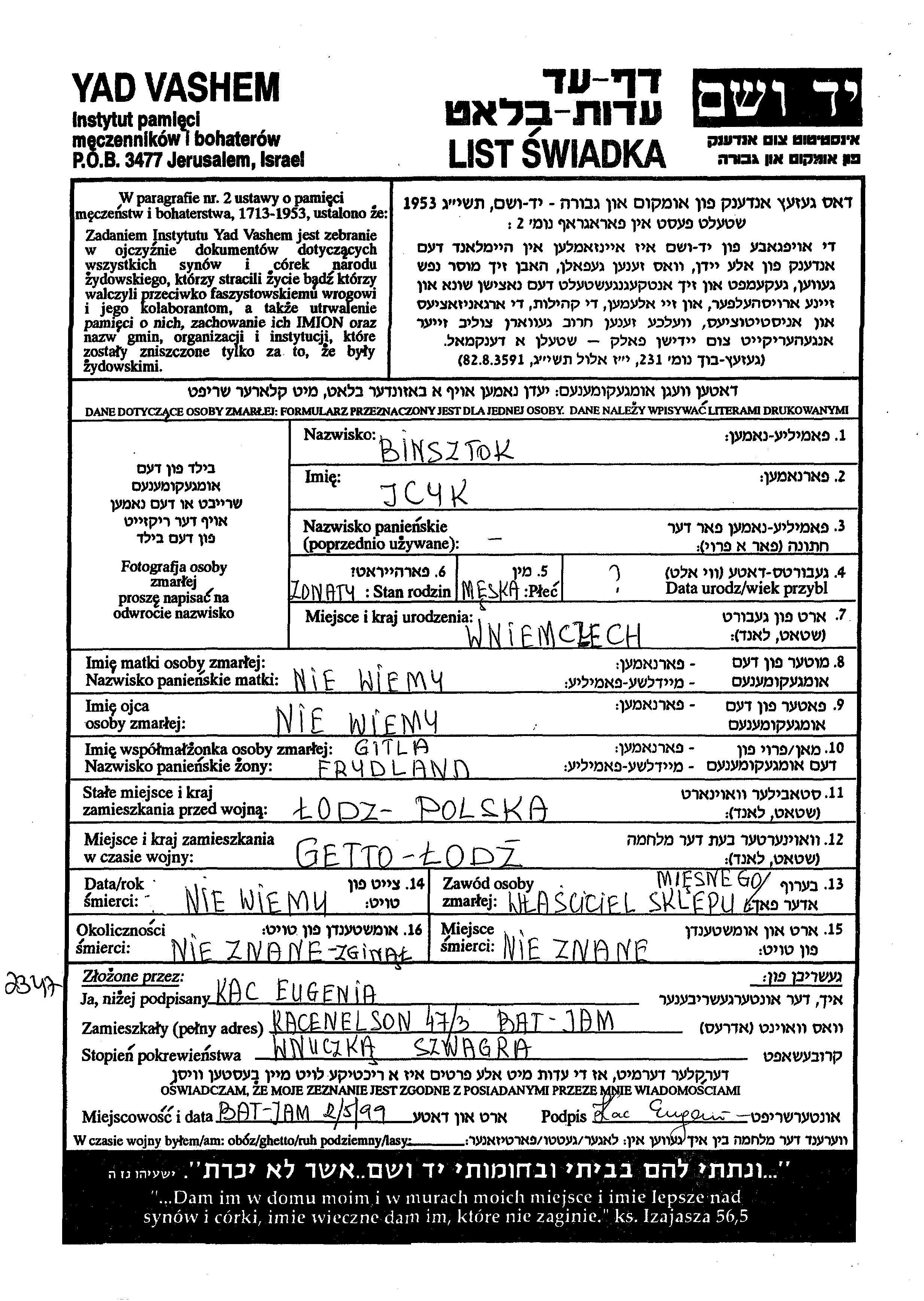 Биншток Ицик Лодзь, Польша Лист свидетельских показаний