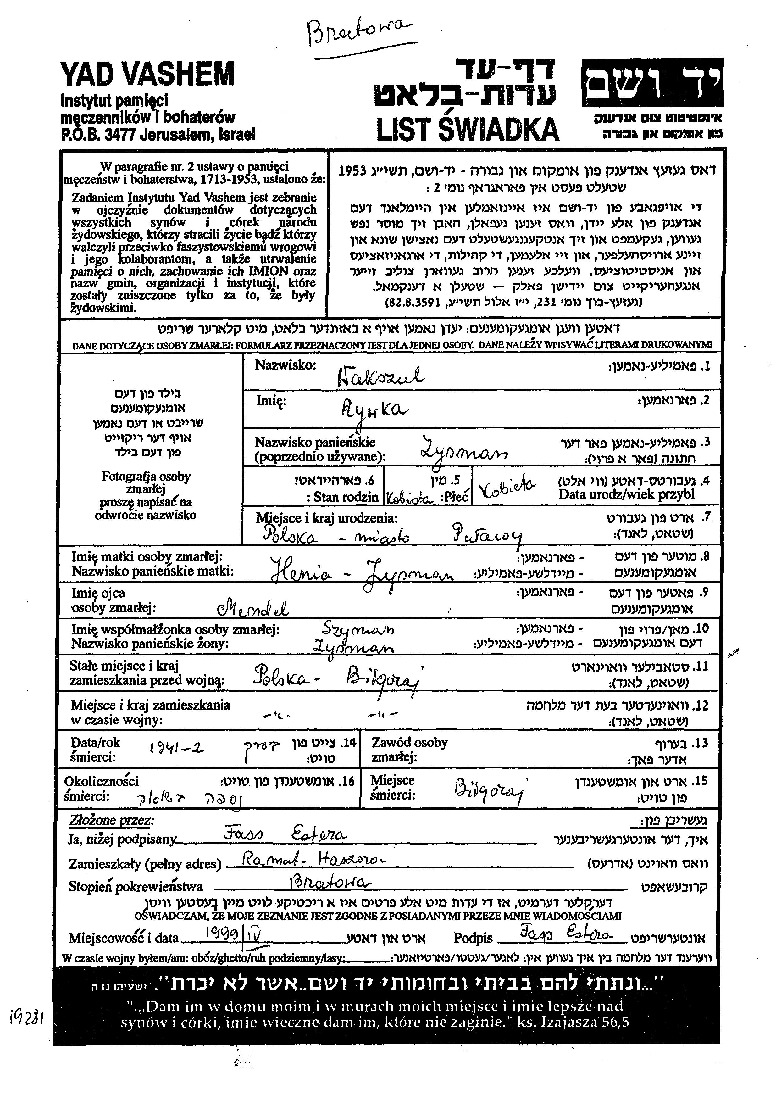 Яд Вашем - Листы свидетельских показаний Мемориального фонда