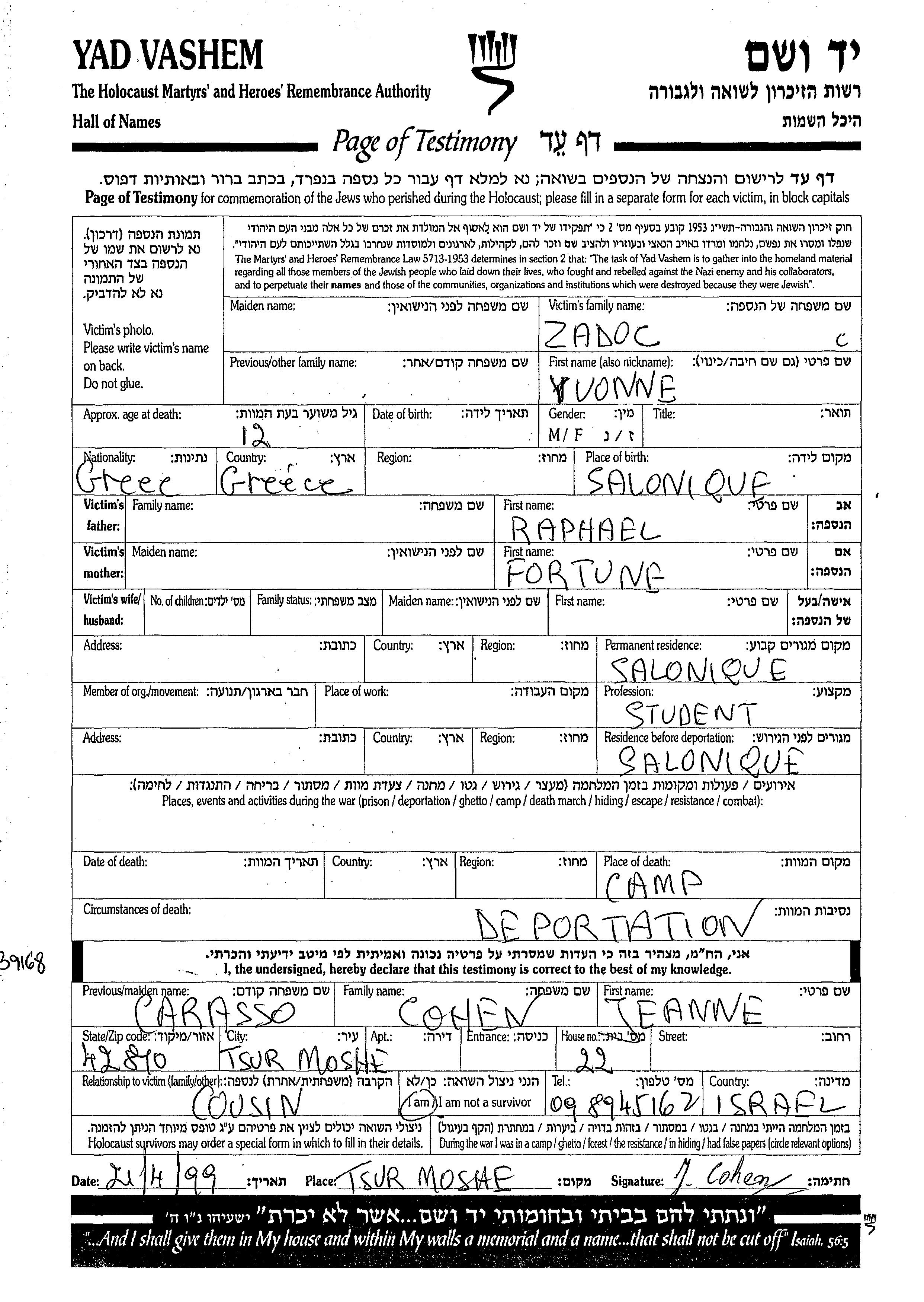 Ивон Задок, место рождения: Салоники, Греция. Отец: Рафаэль, mать:Фортуне. Студент / студентка. Ребенок. Место жительства до войны: Салоники, Греция. Место во время войны: Салоники, Греция.