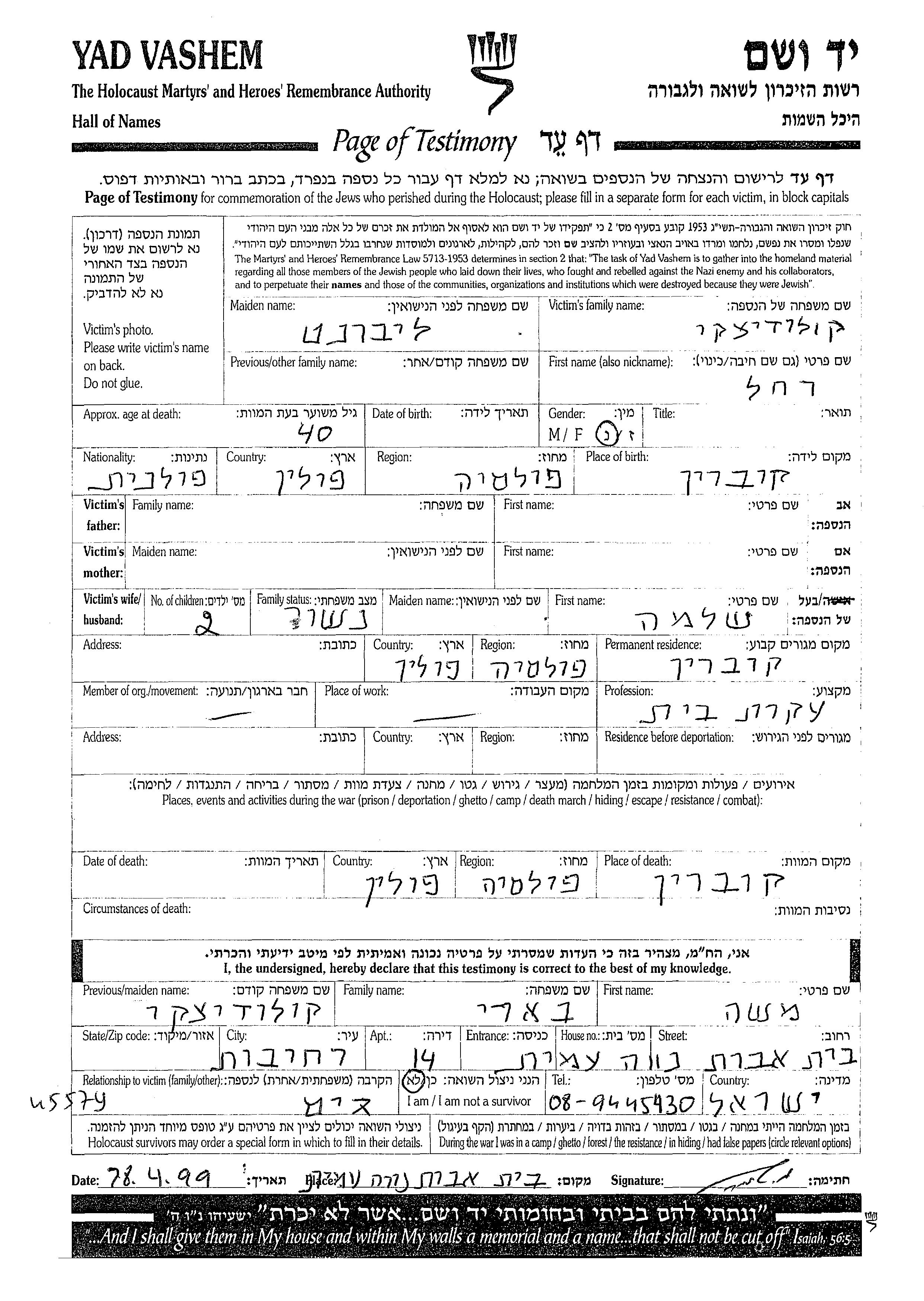 Яд Вашем - Листы свидетельских показаний Мемориального фонда