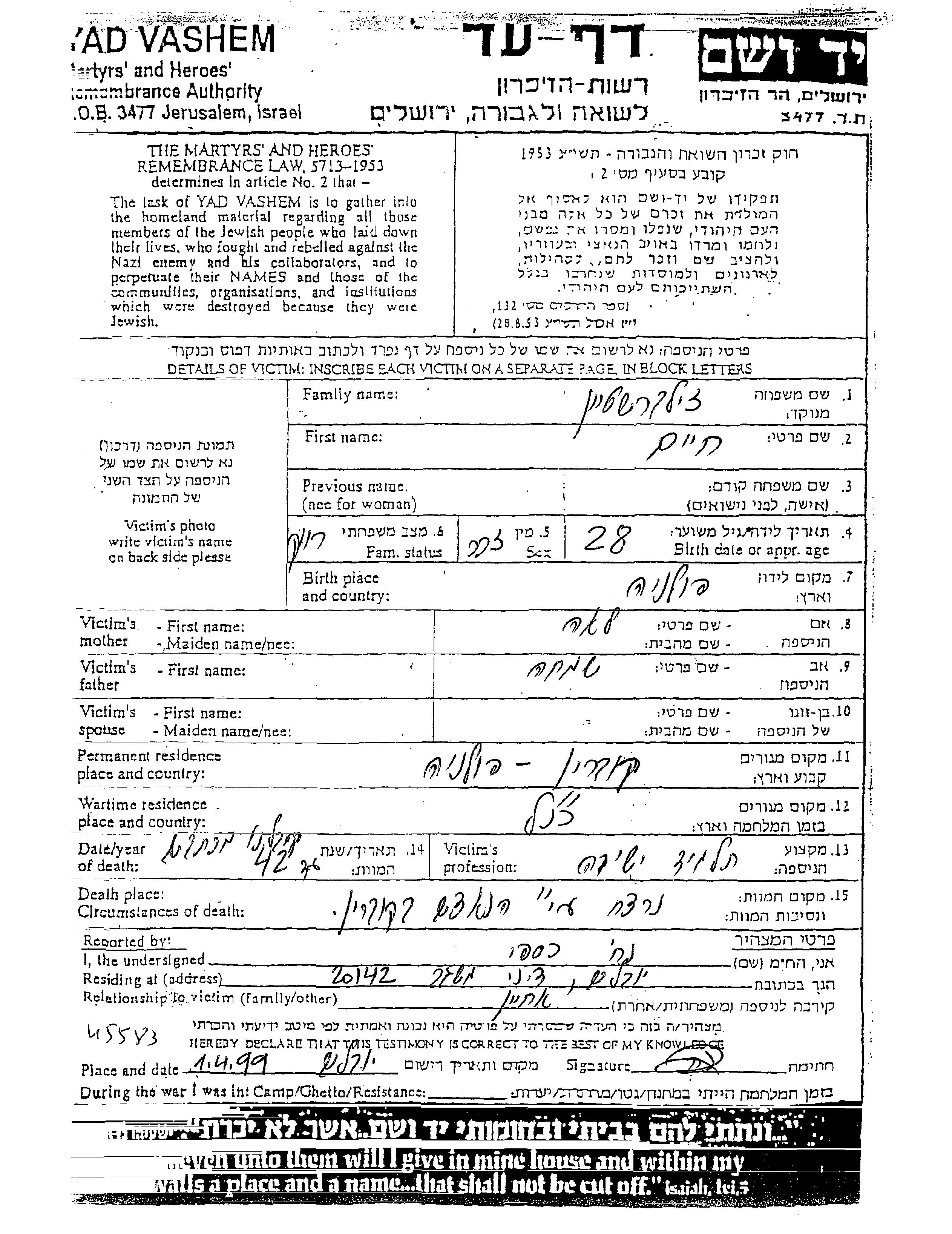 Хаим Зильберштейн, место рождения: Польша. Отец: Симха, mать:Лея. Учащийся иешивы. Холост / не замужем. Место жительства до войны: Кобрынь, Польша. Место во время войны: Кобрынь, Польша.