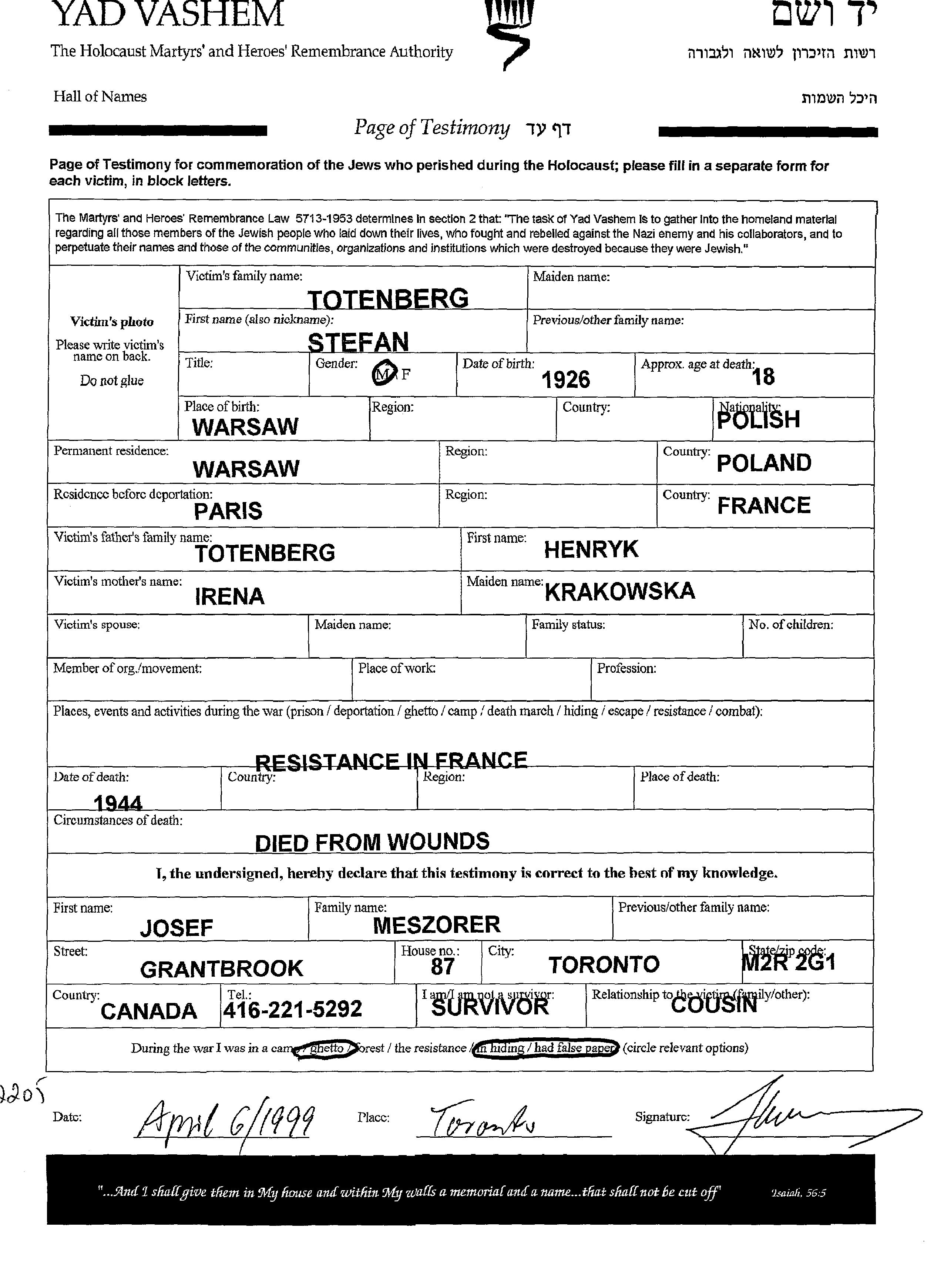 Стефан Тотенберг, место рождения: Варшава, Польша. Отец: Хенрик, mать:Ирена. Место жительства до войны: Варшава, Польша. Место во время войны: Париж, Франция.