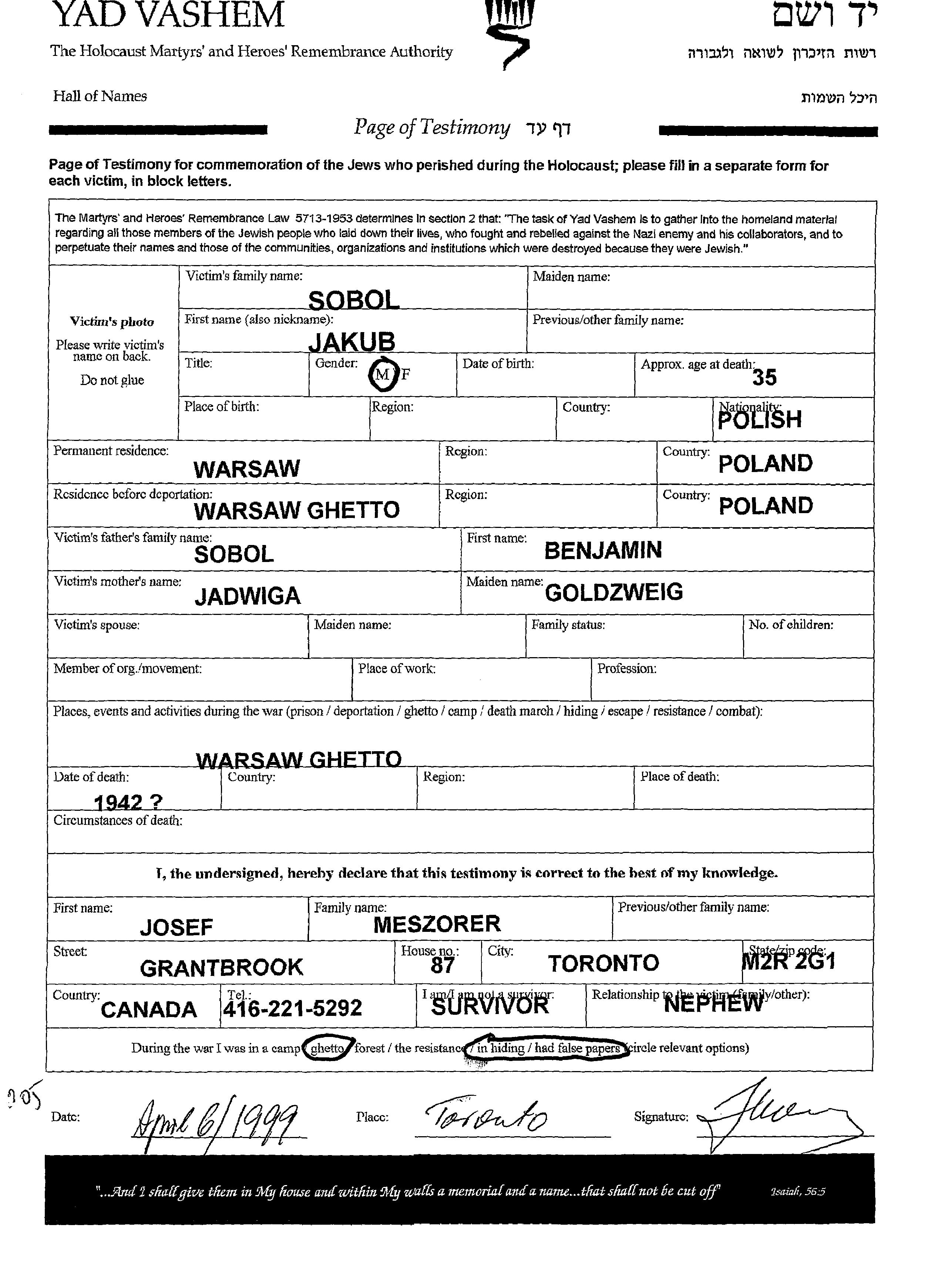 Якуб Соболь Беньямин Ядвига. Место жительства до войны: Варшава, Польша. Место во время войны: Варшава, Польша.