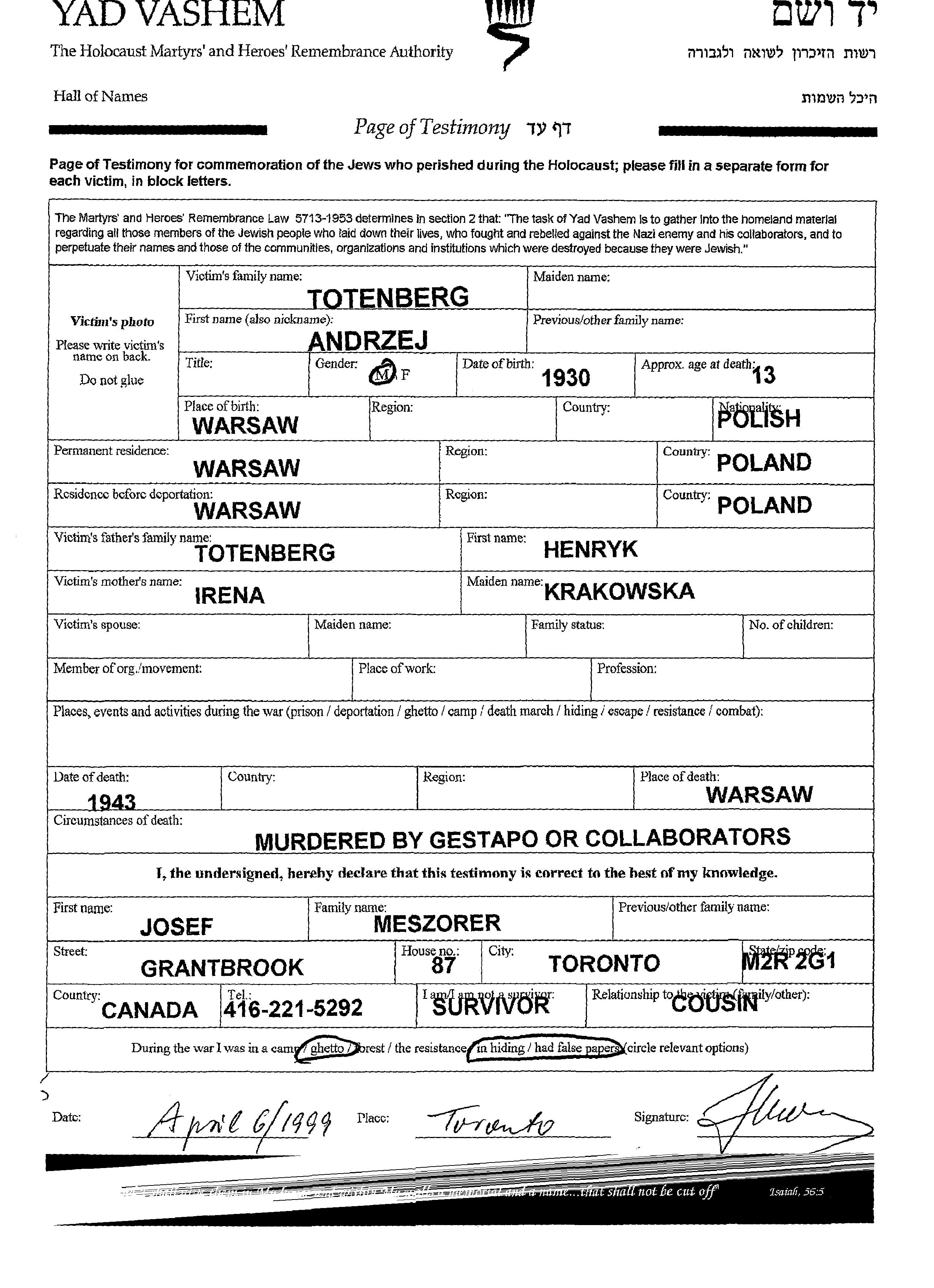 Анджей Тотенберг, место рождения: Варшава, Польша. Отец: Хенрик, mать:Ирена. Место жительства до войны: Варшава, Польша. Место во время войны: Варшава, Польша.
