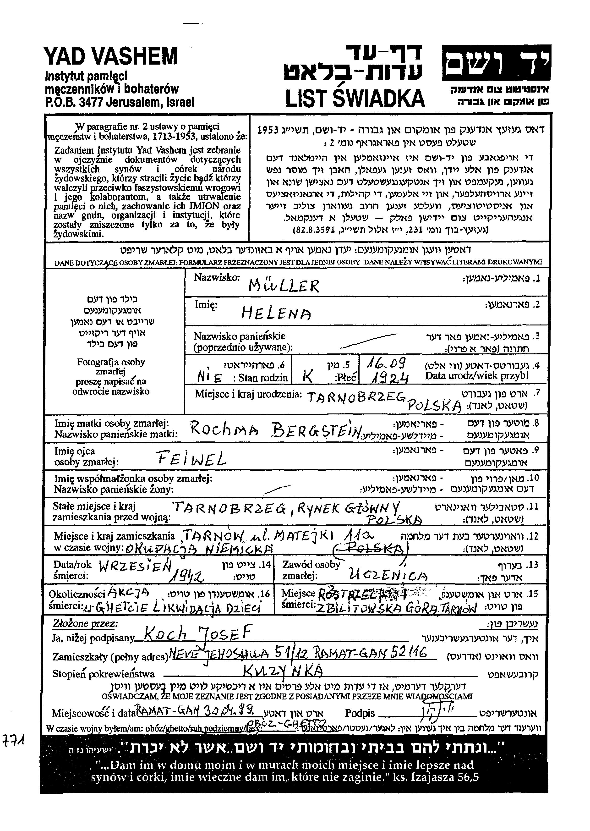 Хелена Муллер, место рождения: Тарнобжег, Польша. Отец: Фейвел, mать:Рохма. Ученик / ученица. Холост / не замужем. Место жительства до войны: Тарнобжег, Польша. Место во время войны: Тарнобжег, Польша.