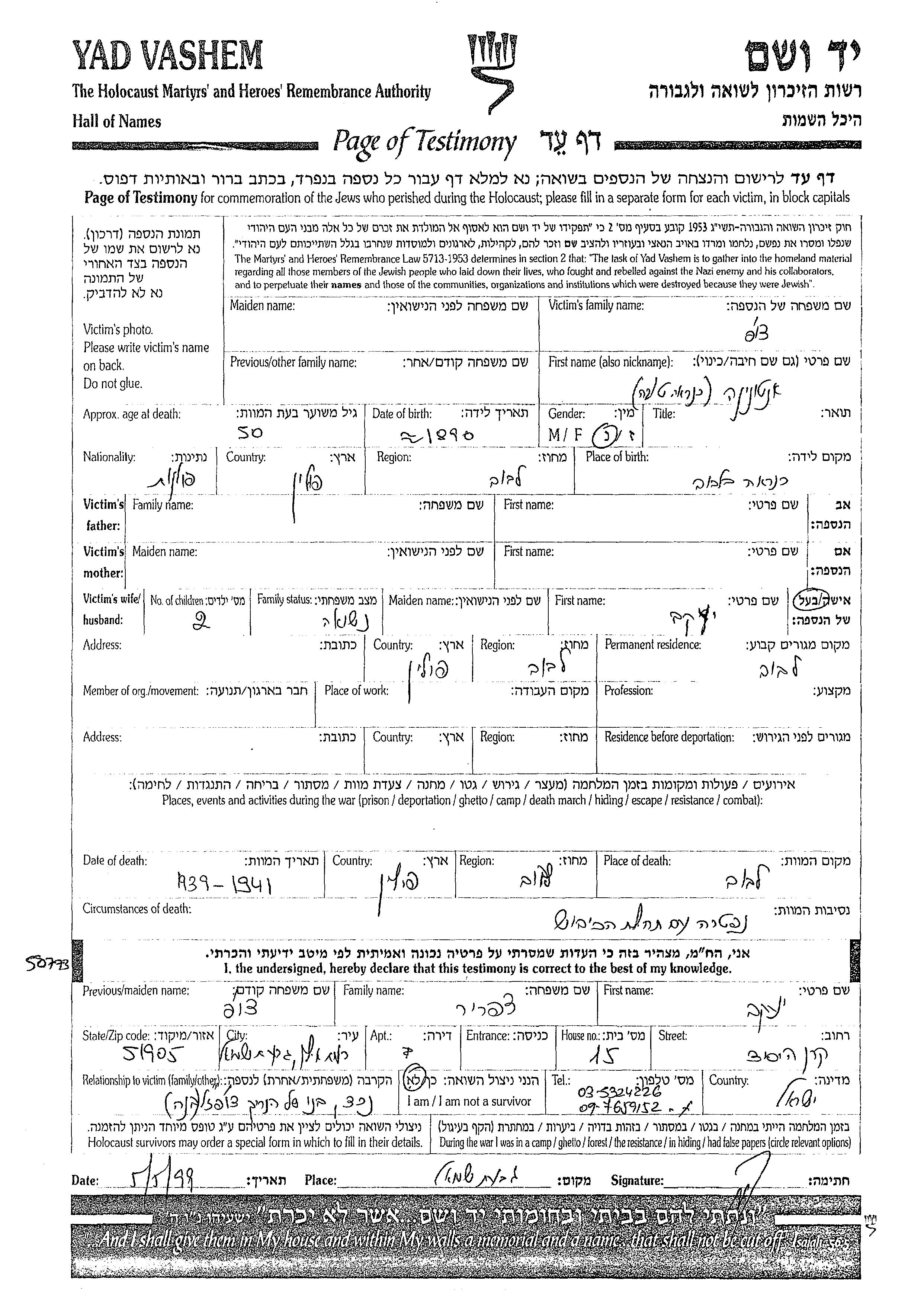 Яд Вашем - Листы свидетельских показаний Мемориального фонда