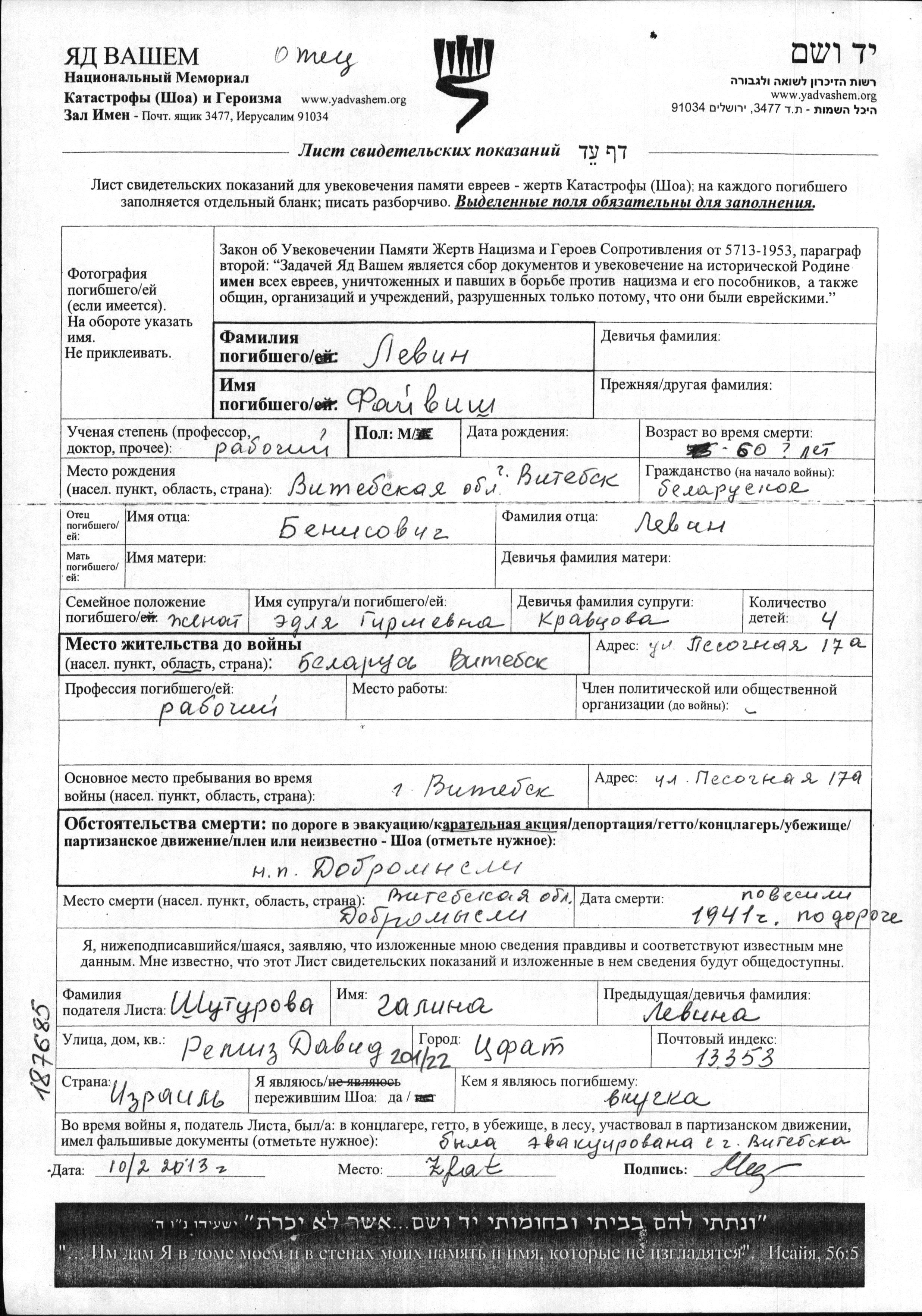Файвиш Левин, место рождения: Витебск, Белоруссия (СССР). Отец: Бениш. Рабочий / рабочая. Женат / замужем. Место жительства до войны: Витебск, Белоруссия (СССР). Место во время войны: Витебск, Белоруссия (СССР).