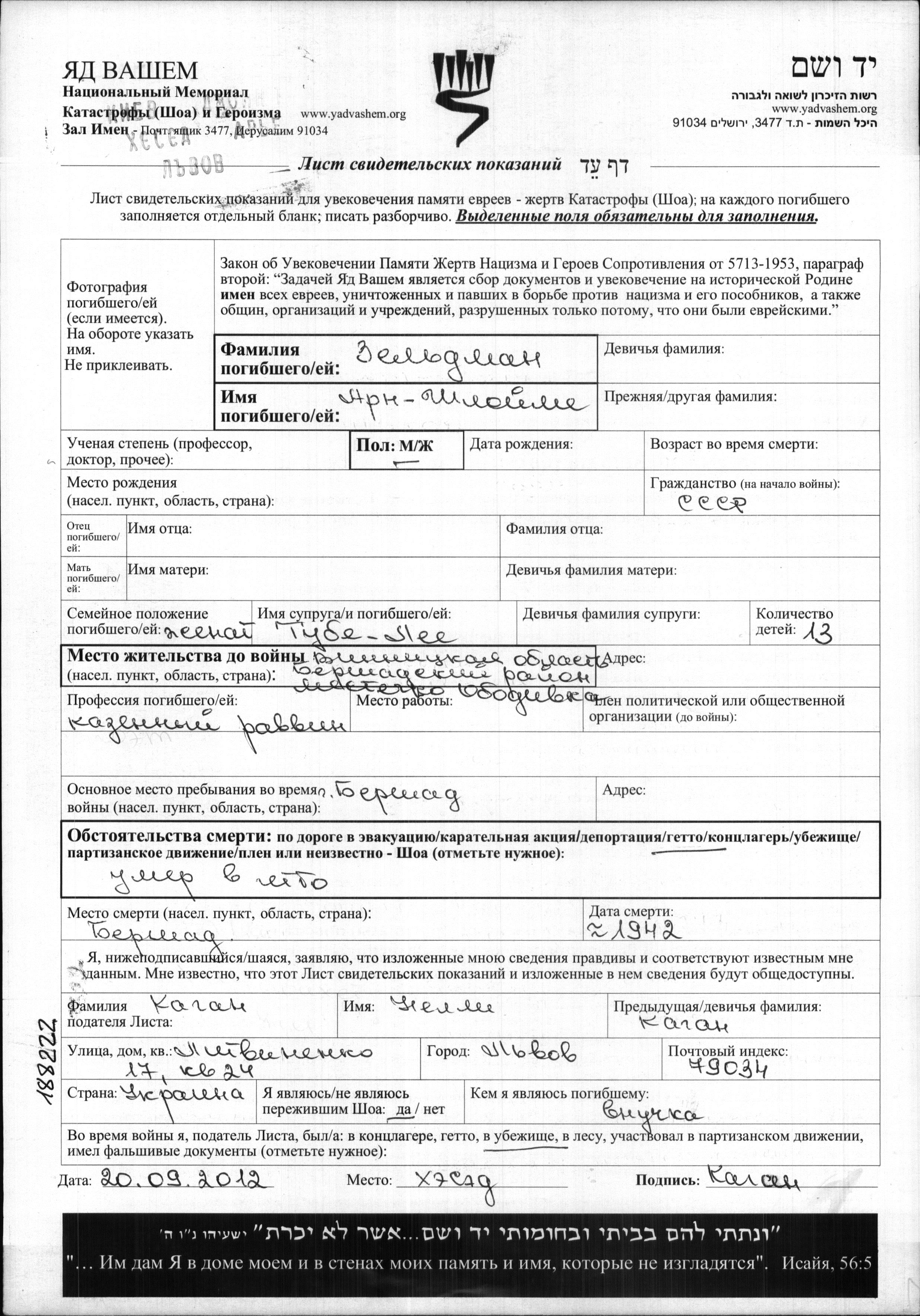 Зельдман Арн Шлойме Ободовка, Украина (СССР) Лист свидетельских показаний