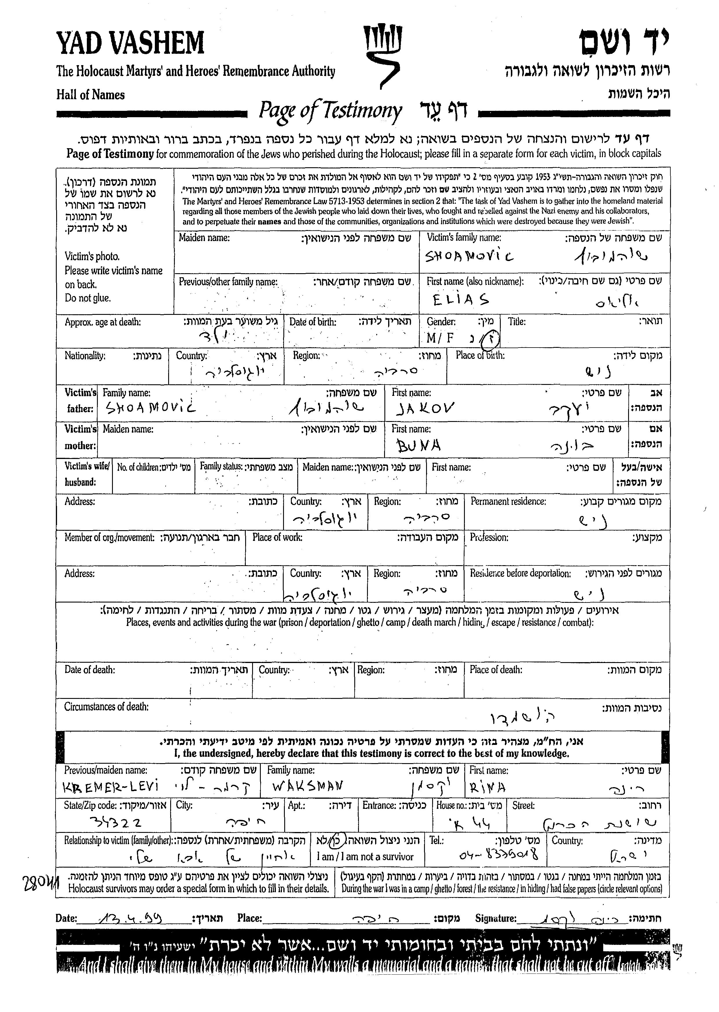 Шоамовиц Элиас Ниш, Югославия Лист свидетельских показаний