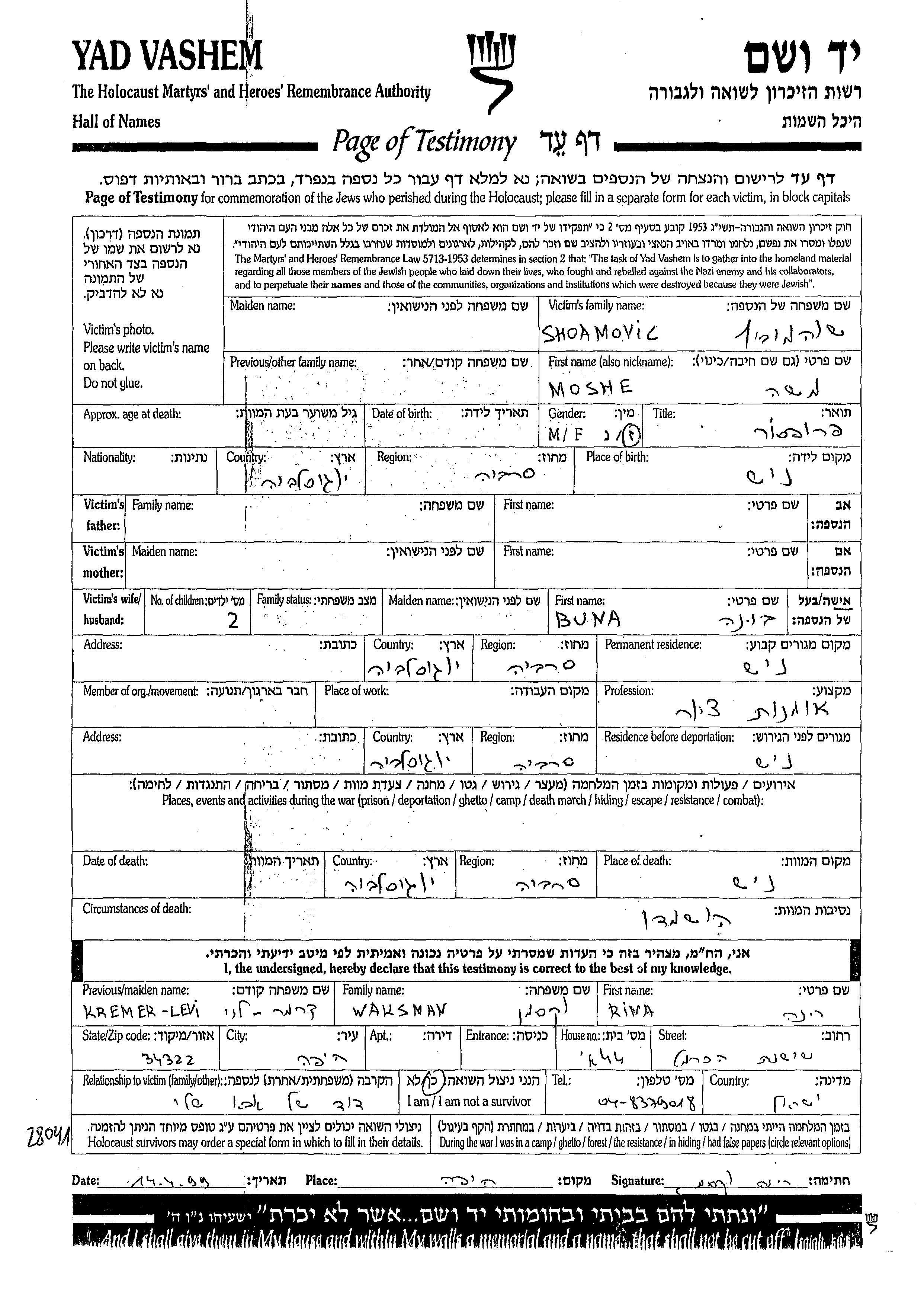Шоамовиц Моше Ниш, Югославия Лист свидетельских показаний