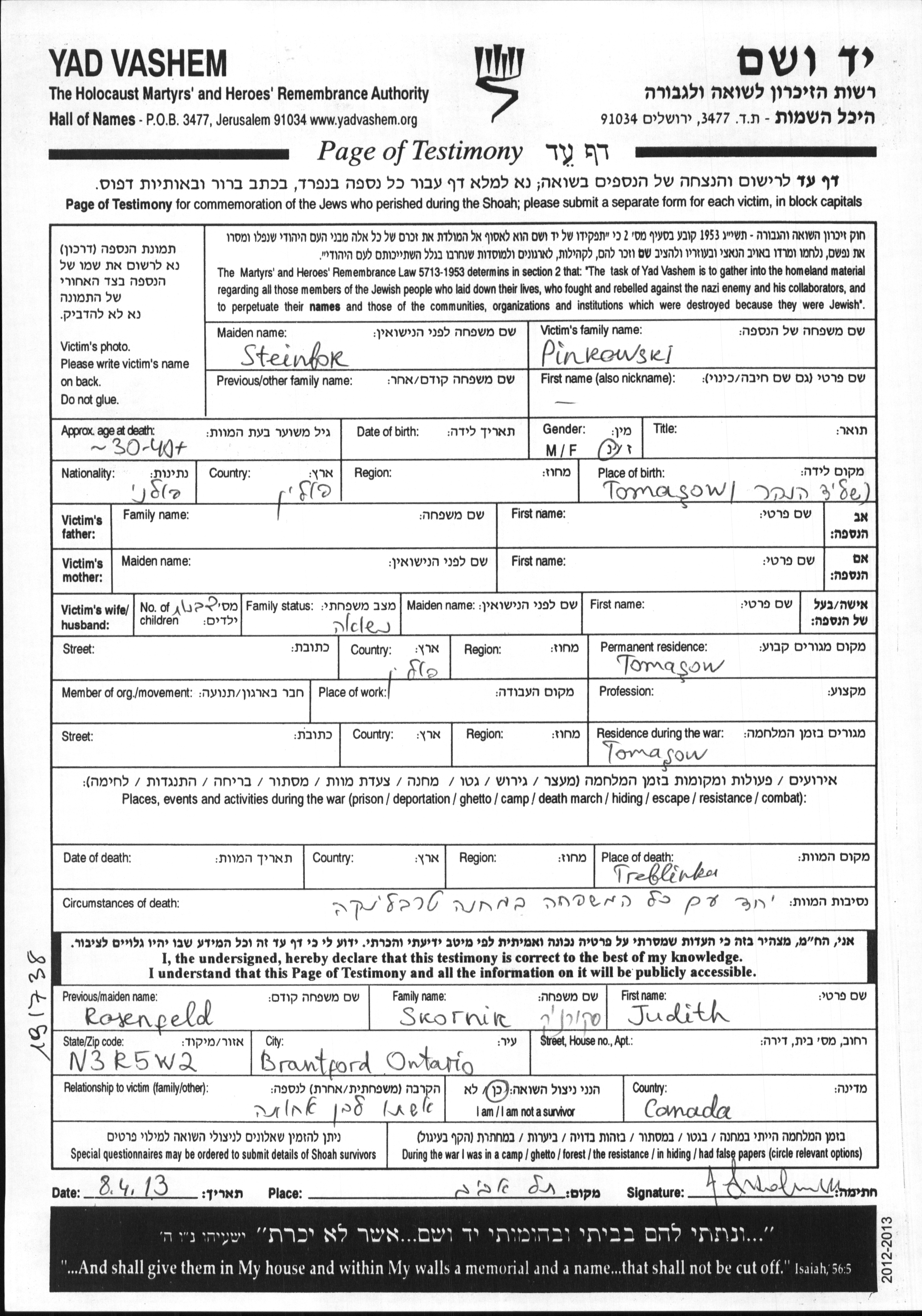 Имя неизвестно Штайнбок, девичья фамилия Пинковски, место рождения: Томашув, Польша. Женат / замужем. Место жительства до войны: Томашув, Польша. Место во время войны: Томашув, Польша.
