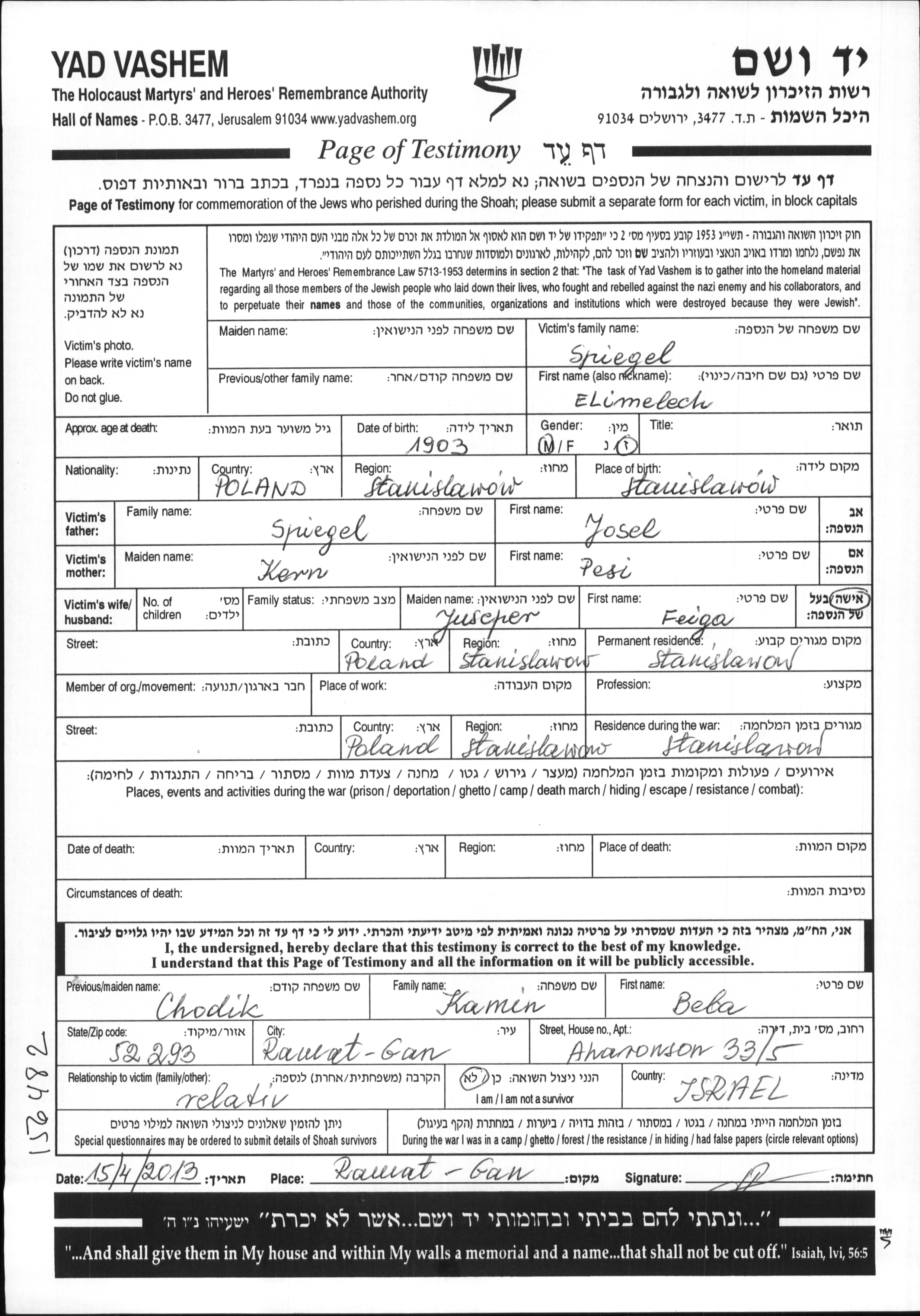Элимелех Шпигель, место рождения: Станиславув, Польша. Отец: Йосел, mать:Песи, девичья фамилия Керн. Женат / замужем. Место жительства до войны: Станиславув, Польша. Место во время войны: Станиславув, Польша.