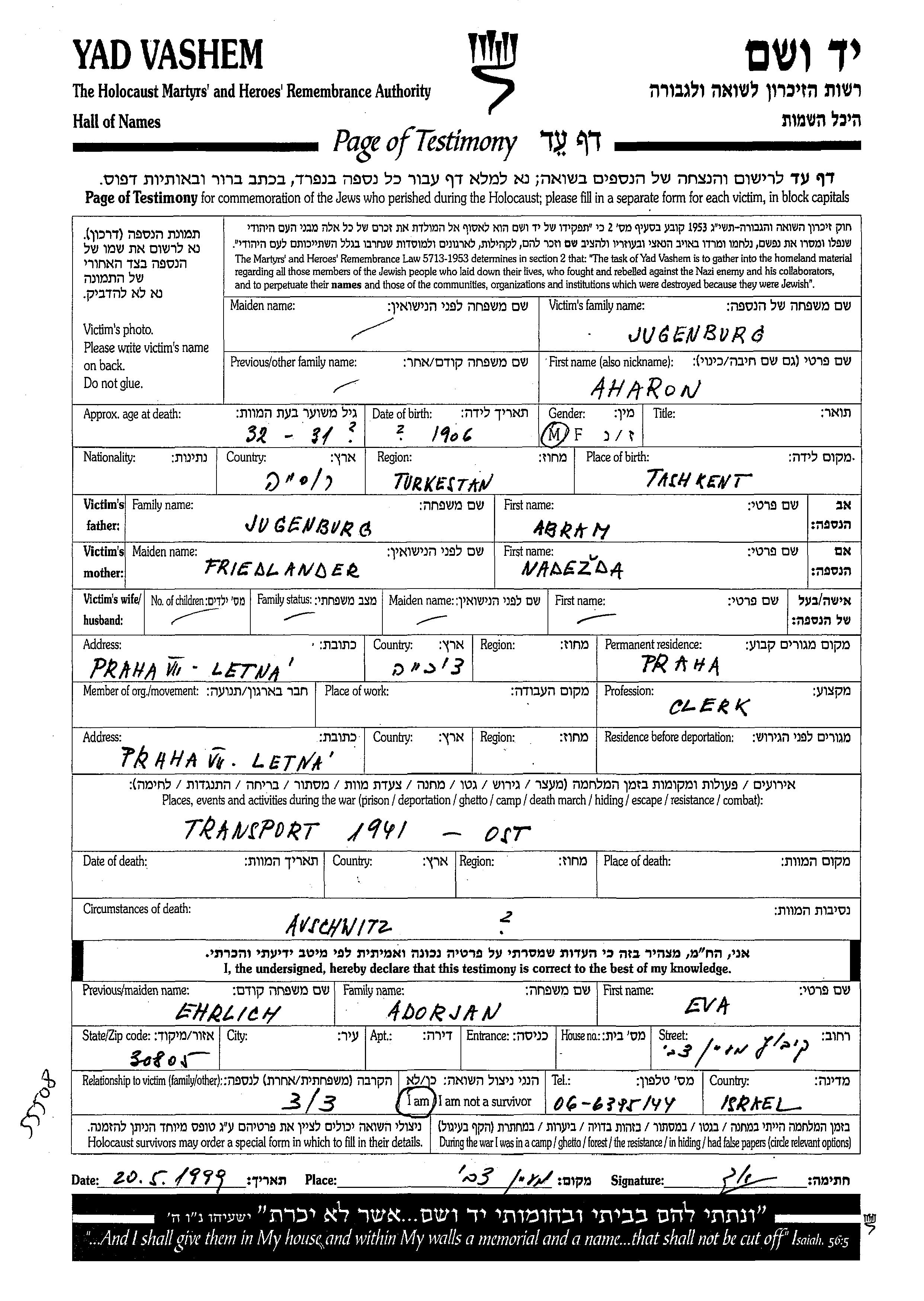 Арон Югенбург, место рождения: Ташкент, Узбекистан (СССР). Отец: Абрам, mать:Надежда. Клерк. Место жительства до войны: Прага, Чехословакия. Место во время войны: Прага, Чехословакия.