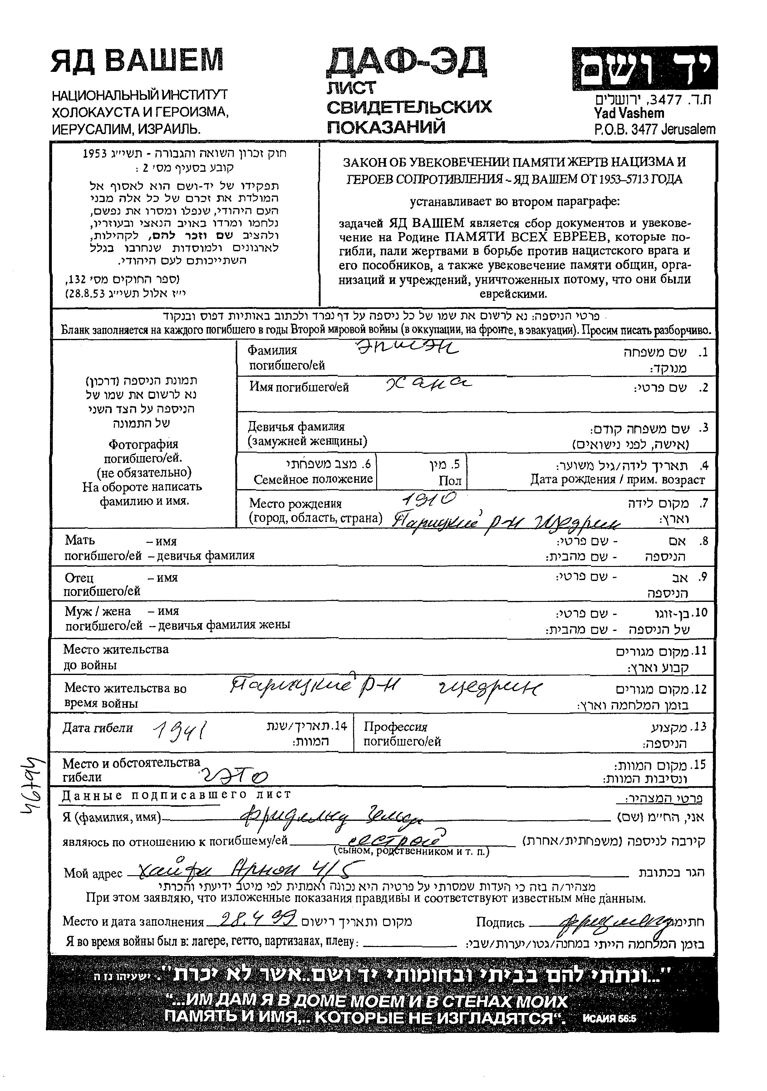 Яд Вашем - Листы свидетельских показаний Мемориального фонда