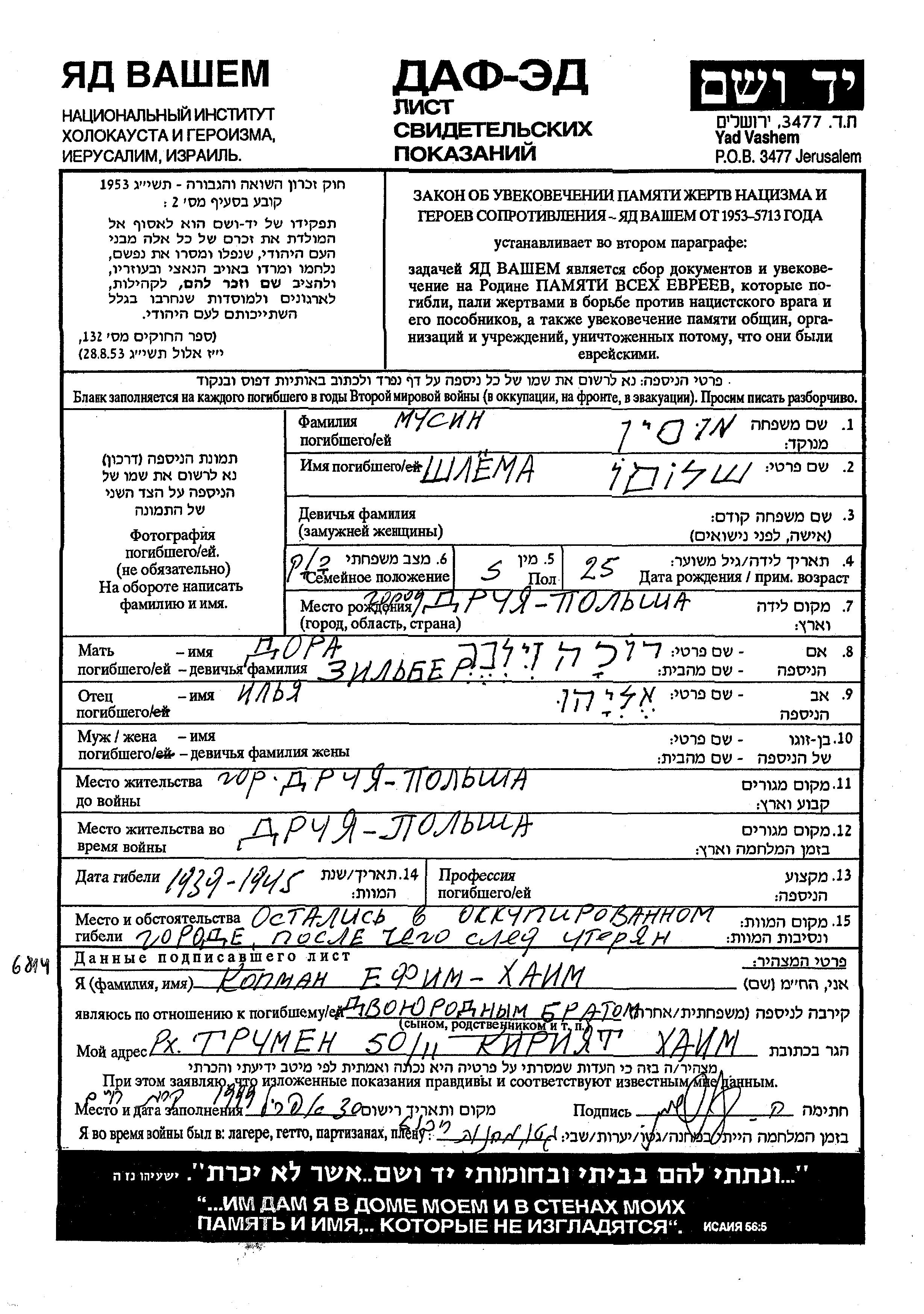 Яд Вашем - Листы свидетельских показаний Мемориального фонда