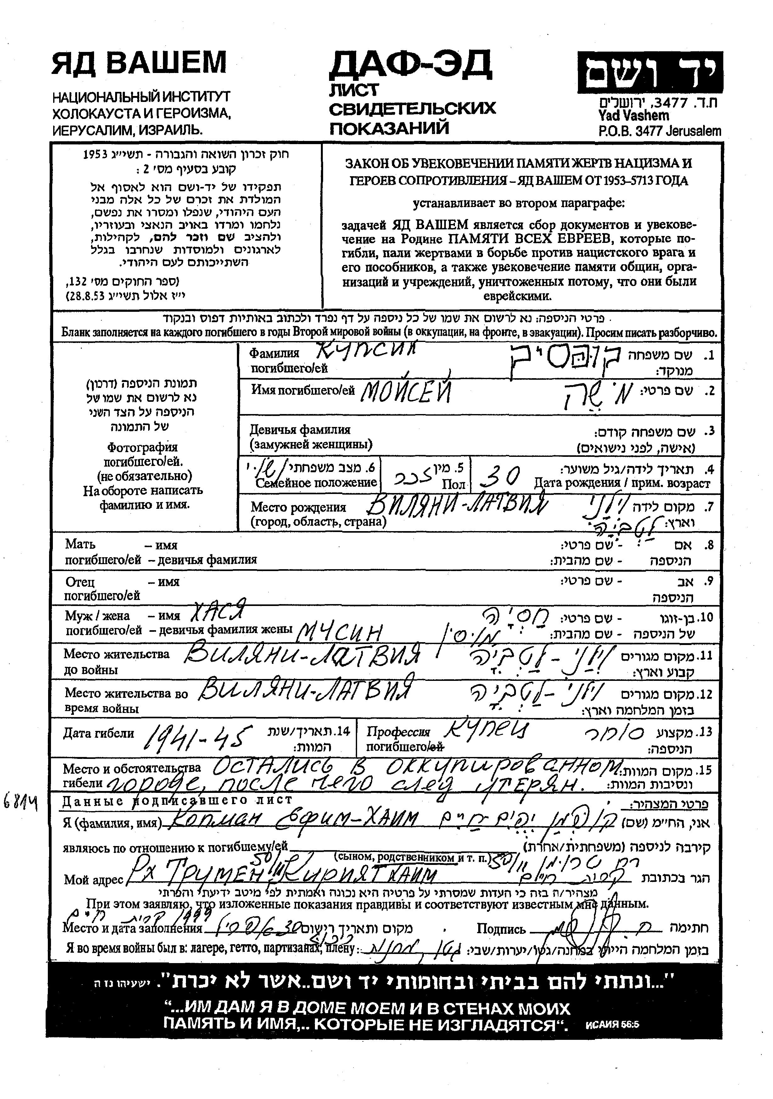 Моисей Купсик, место рождения: Вилани, Латвия. Торговец / торговка. Женат / замужем. Место жительства до войны: Вилани, Латвия. Место во время войны: Вилани, Латвия.