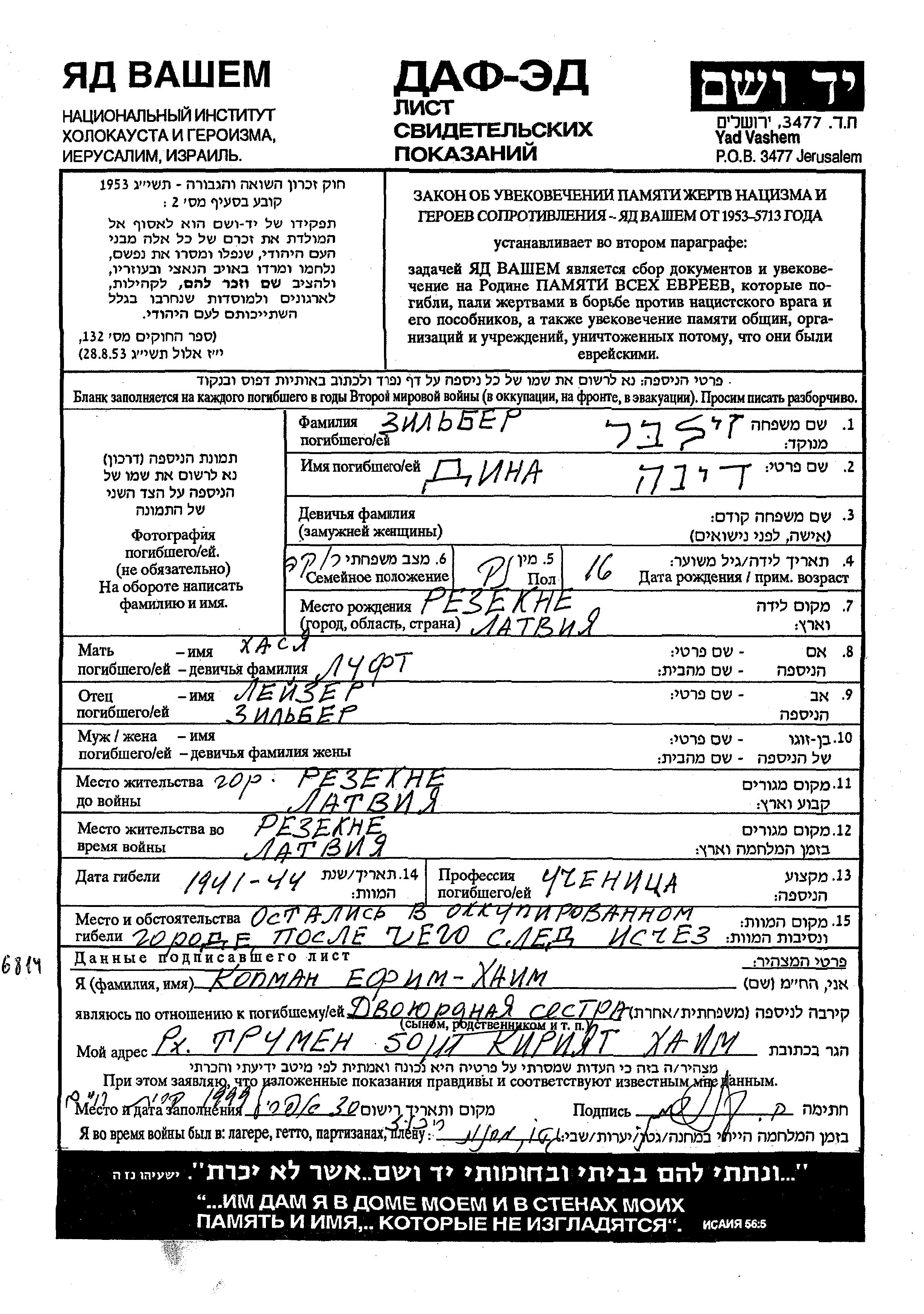 Яд Вашем - Листы свидетельских показаний Мемориального фонда