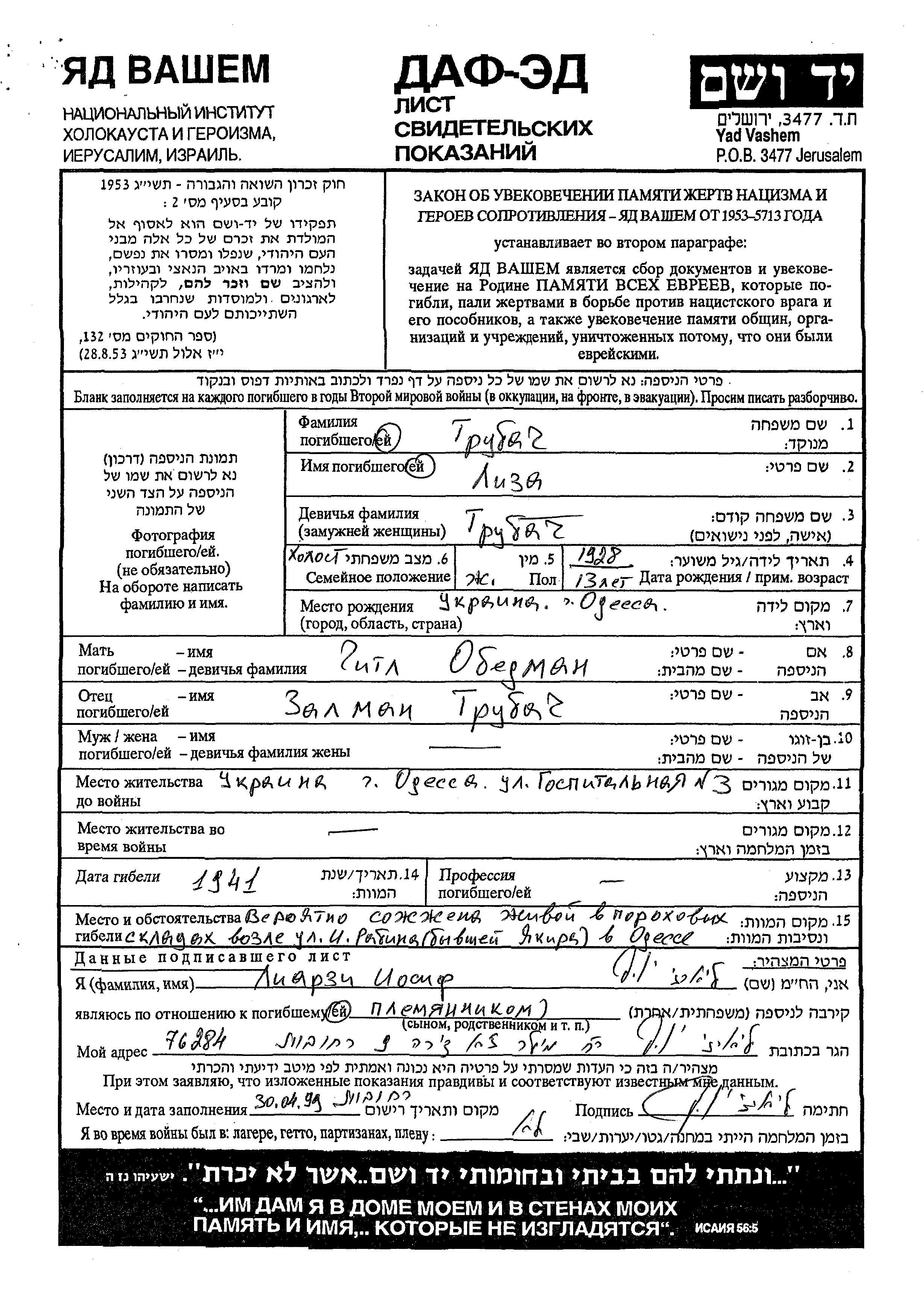Трубач Обедман Лиза 1928 Одесса, Украина (СССР) Лист свидетельских показаний