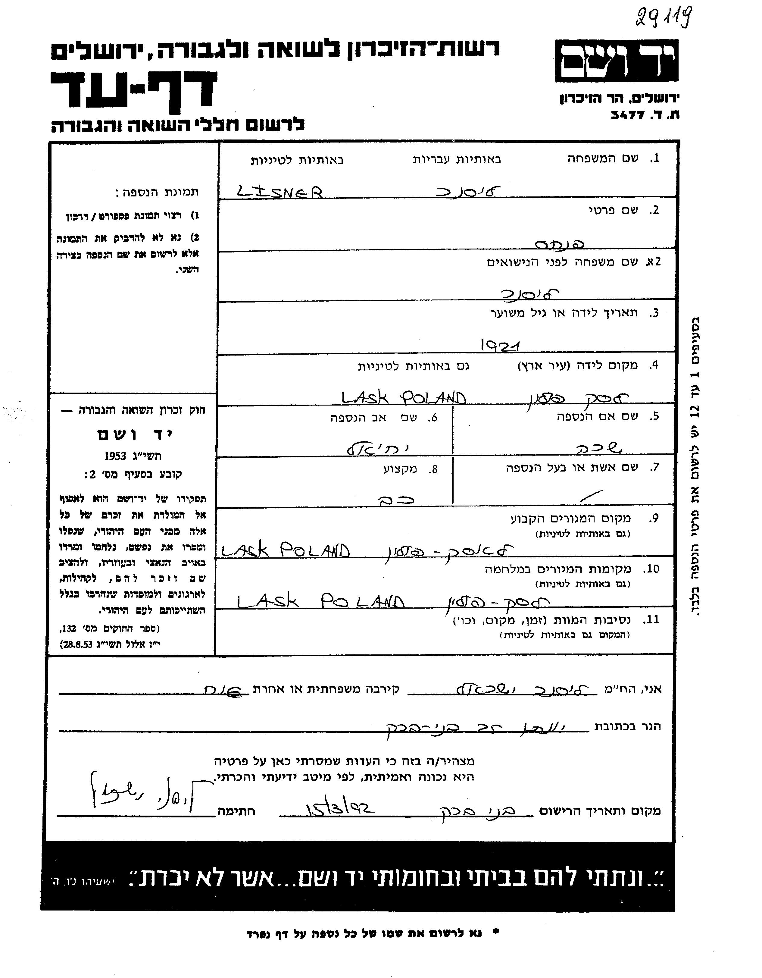 Лиснер Пинхас 1921 Ласк, Польша Лист свидетельских показаний
