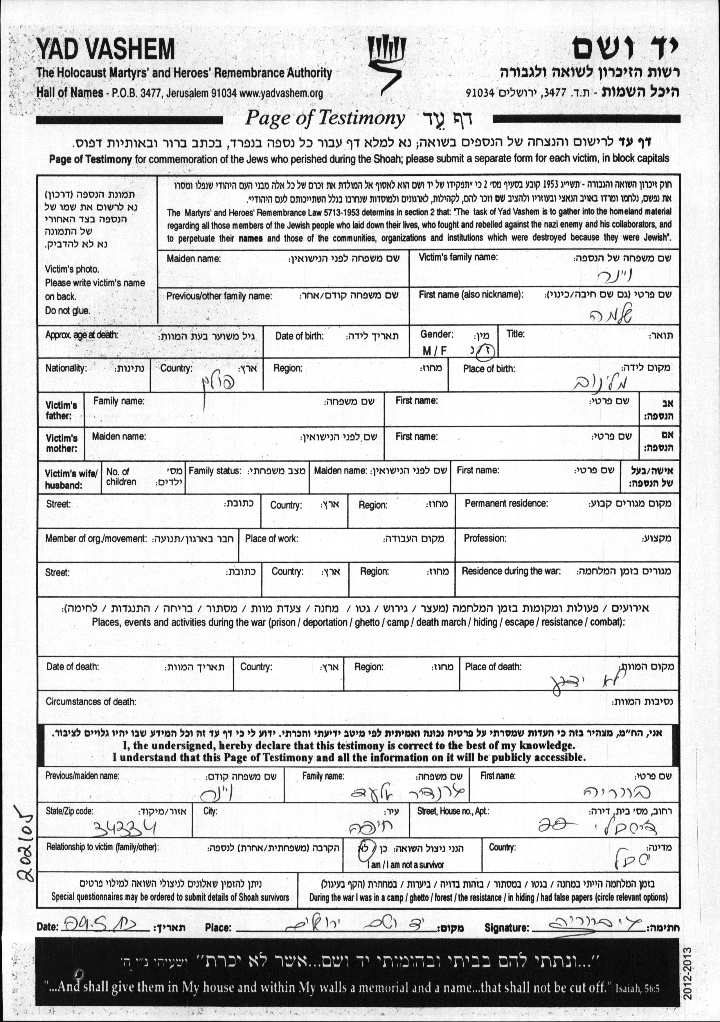 Яд Вашем - Листы свидетельских показаний Мемориального фонда