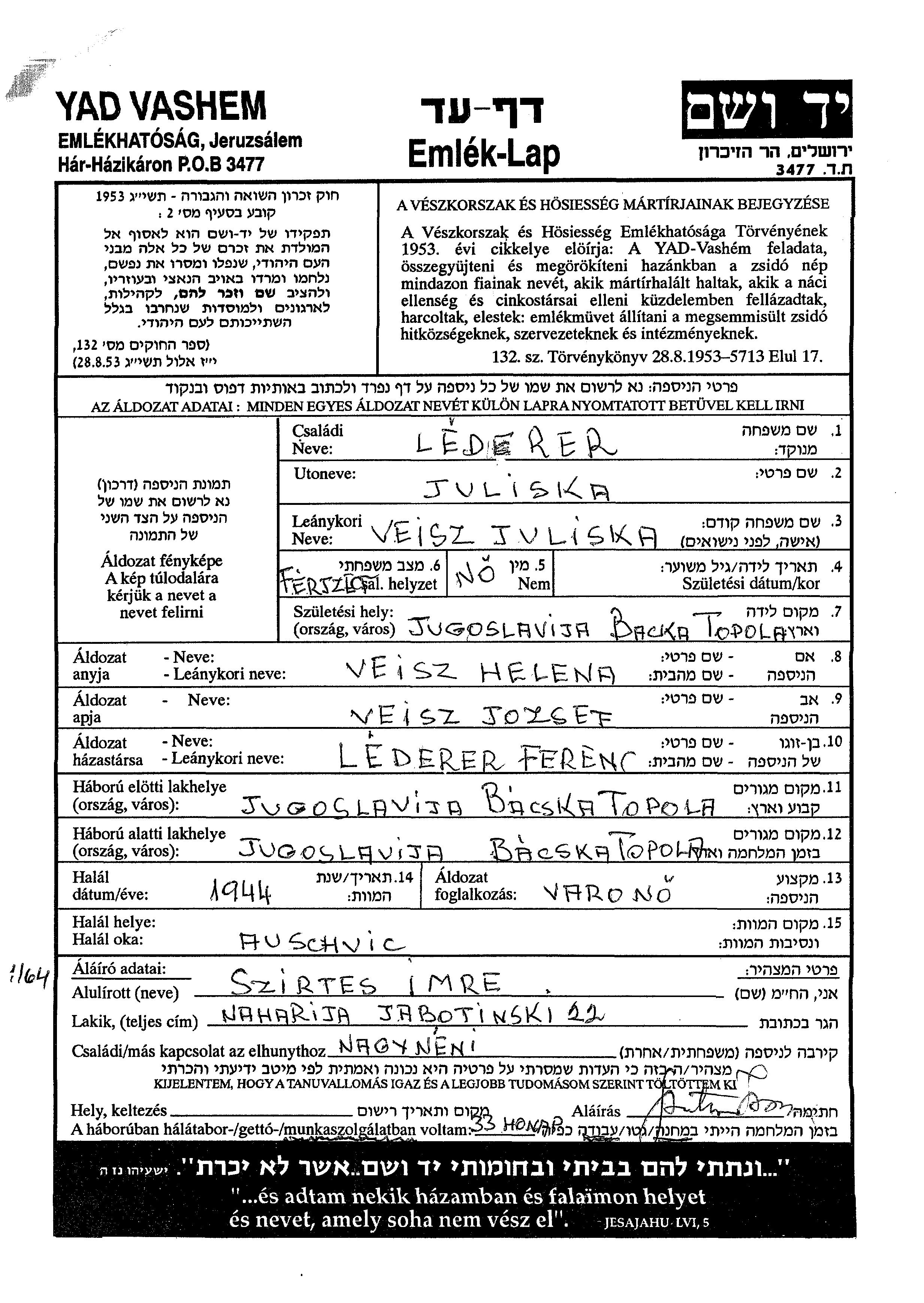 Юлишка Ледерер, девичья фамилия Вейс, место рождения: Бачка Топола, Югославия. Отец: Йозеф, mать:Хелена. Швея. Женат / замужем. Место жительства до войны: Бачка Топола, Югославия. Место во время войны: Бачка Топола, Югославия.