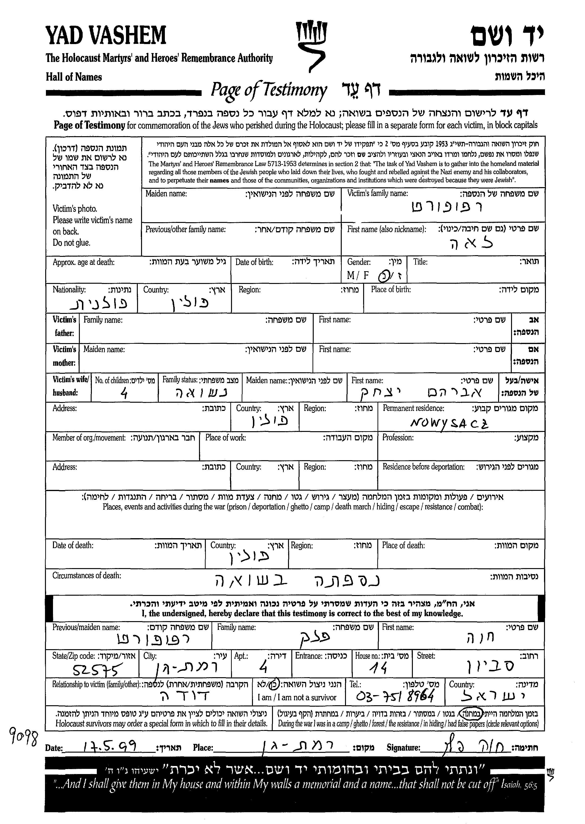 Лея Рапапорт, место рождения: Польша. Женат / замужем. Место жительства до войны: Новы-Сонч, Польша.
