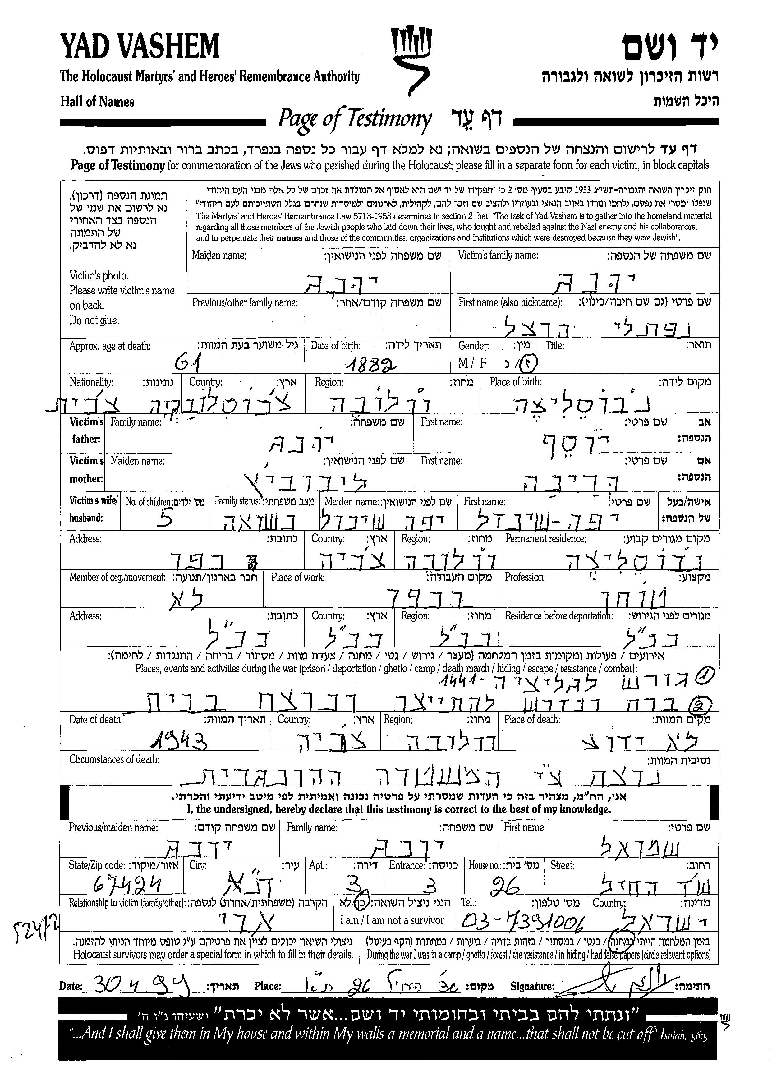 Юнг Нафтали Херцль 1882 Новоселица, Чехословакия Лист свидетельских показаний