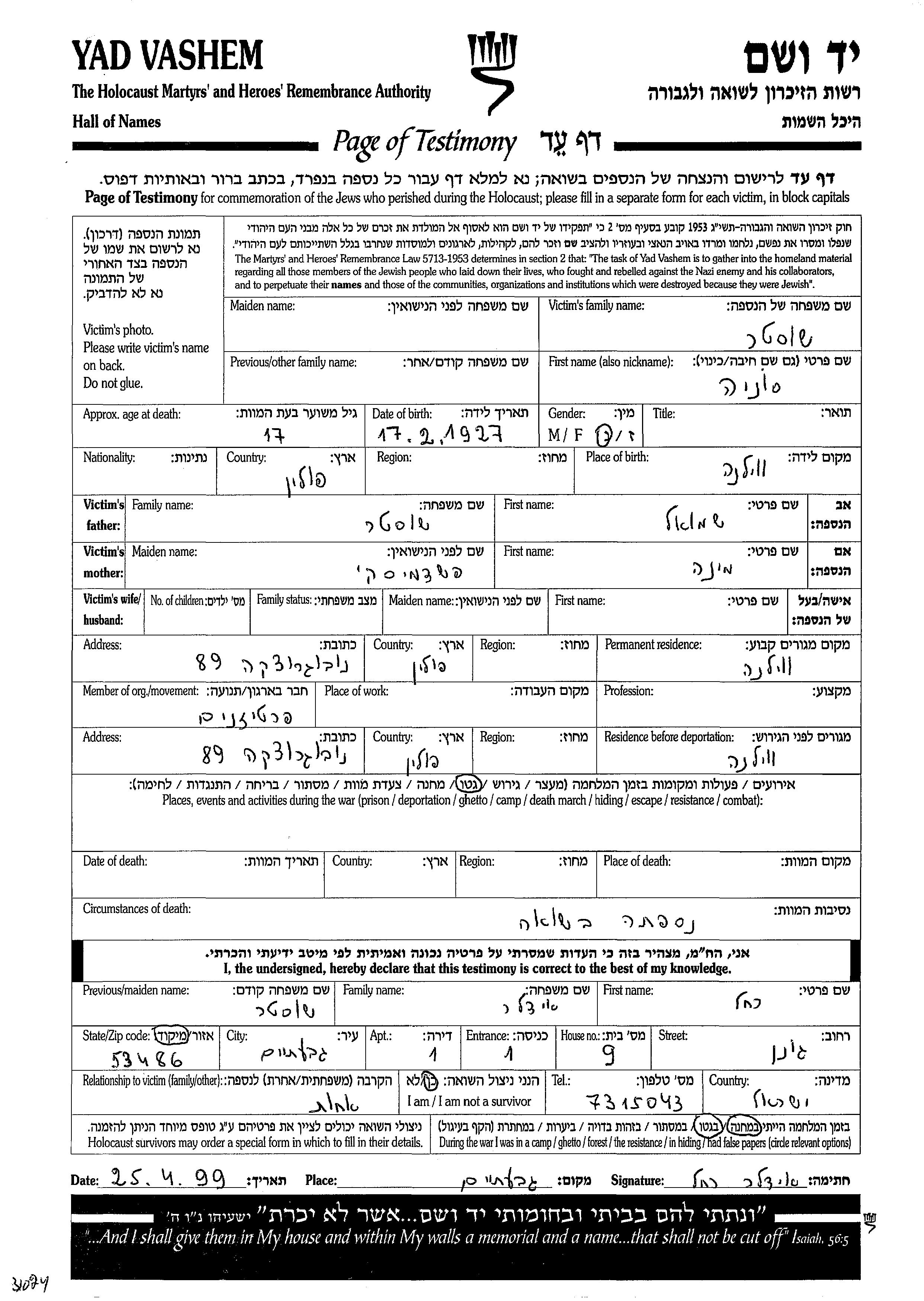Яд Вашем - Листы свидетельских показаний Мемориального фонда