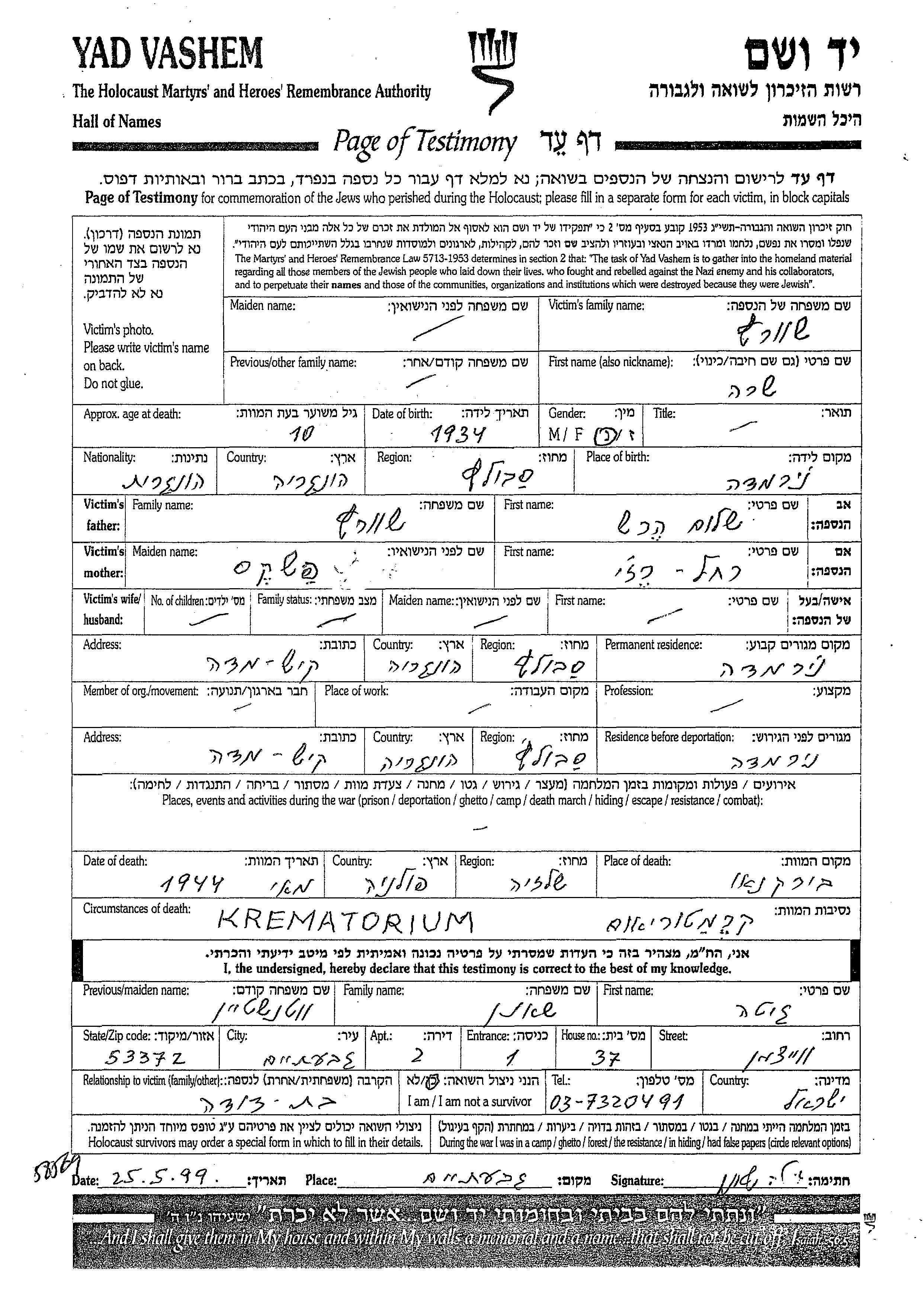 Швец Сара 1934 Ньирмедьеш, Венгрия Лист свидетельских показаний