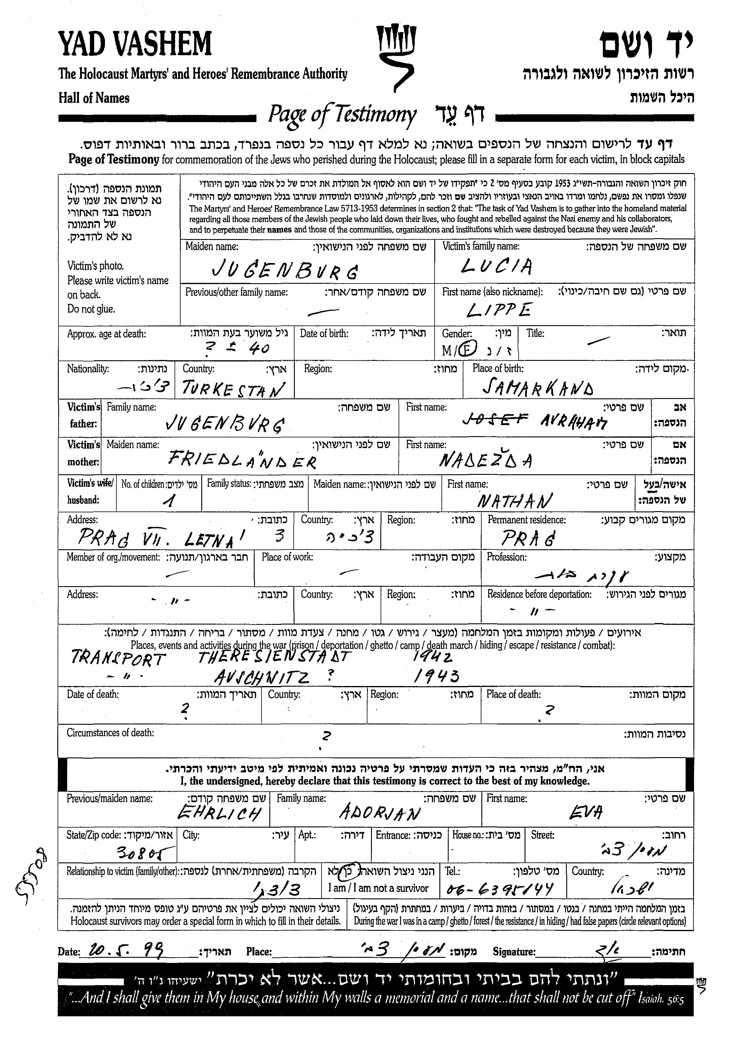 Люция Липпе, девичья фамилия Югенбург, место рождения: Самарканд, Узбекистан (СССР). Отец: Авраам, mать:Надежда. Домохозяйка. Женат / замужем. Место жительства до войны: Прага, Чехословакия. Место во время войны: Прага, Чехословакия.