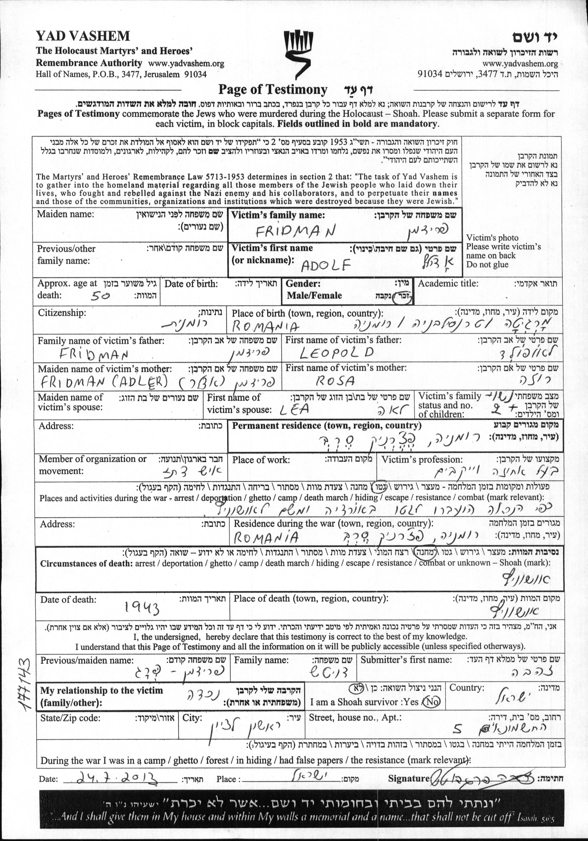 Адольф Фридман, место рождения: Маргита, Румыния. Отец: Леопольд, mать:Роза, девичья фамилия Адлер. Землевладелец. Женат / замужем. Место жительства до войны: Место Не Определено, Румыния. Место во время войны: Орадя-Маре, Румыния.
