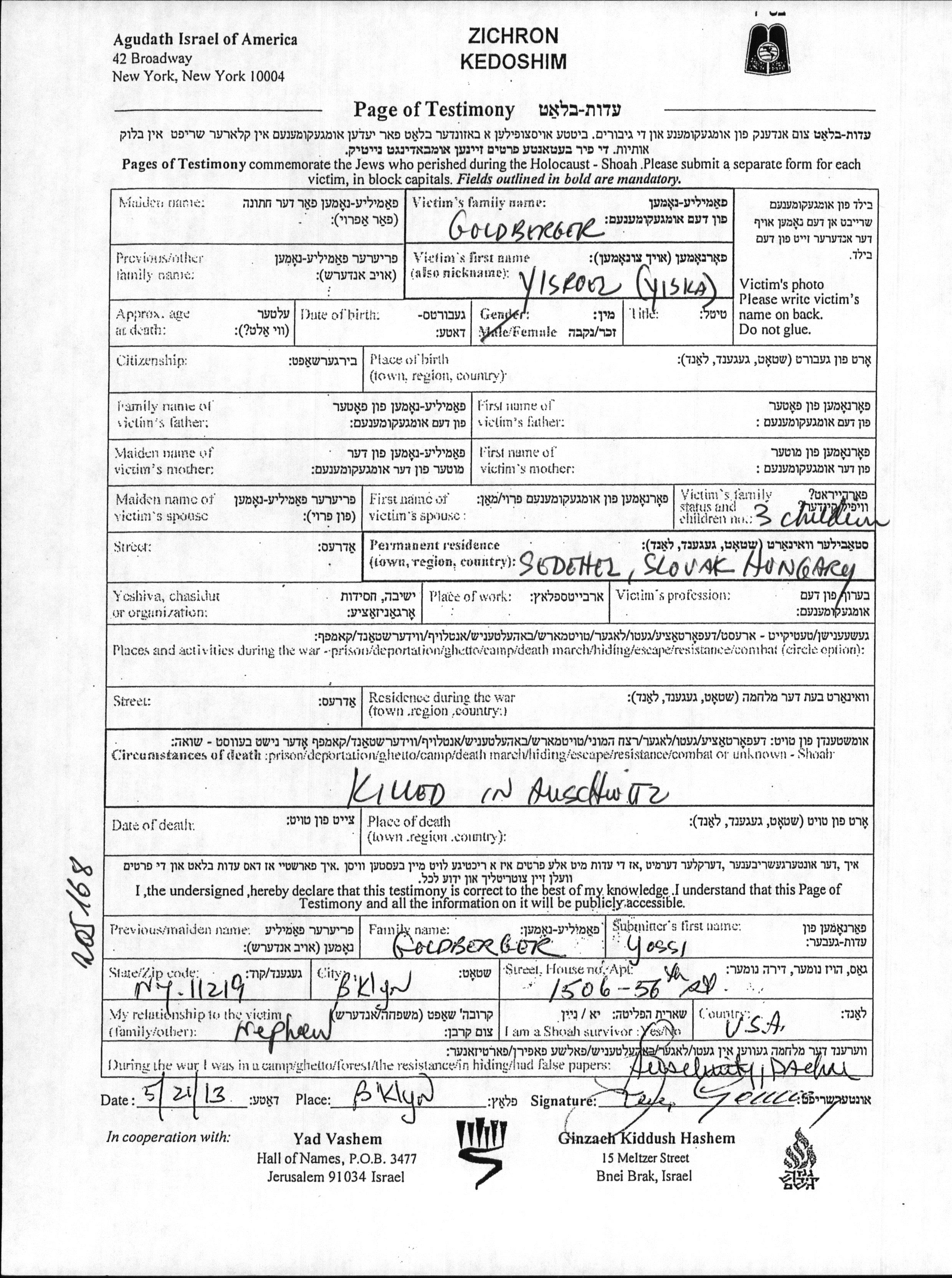 Гольдбергер Исроэль Иска Сердахей, Чехословакия Лист свидетельских показаний