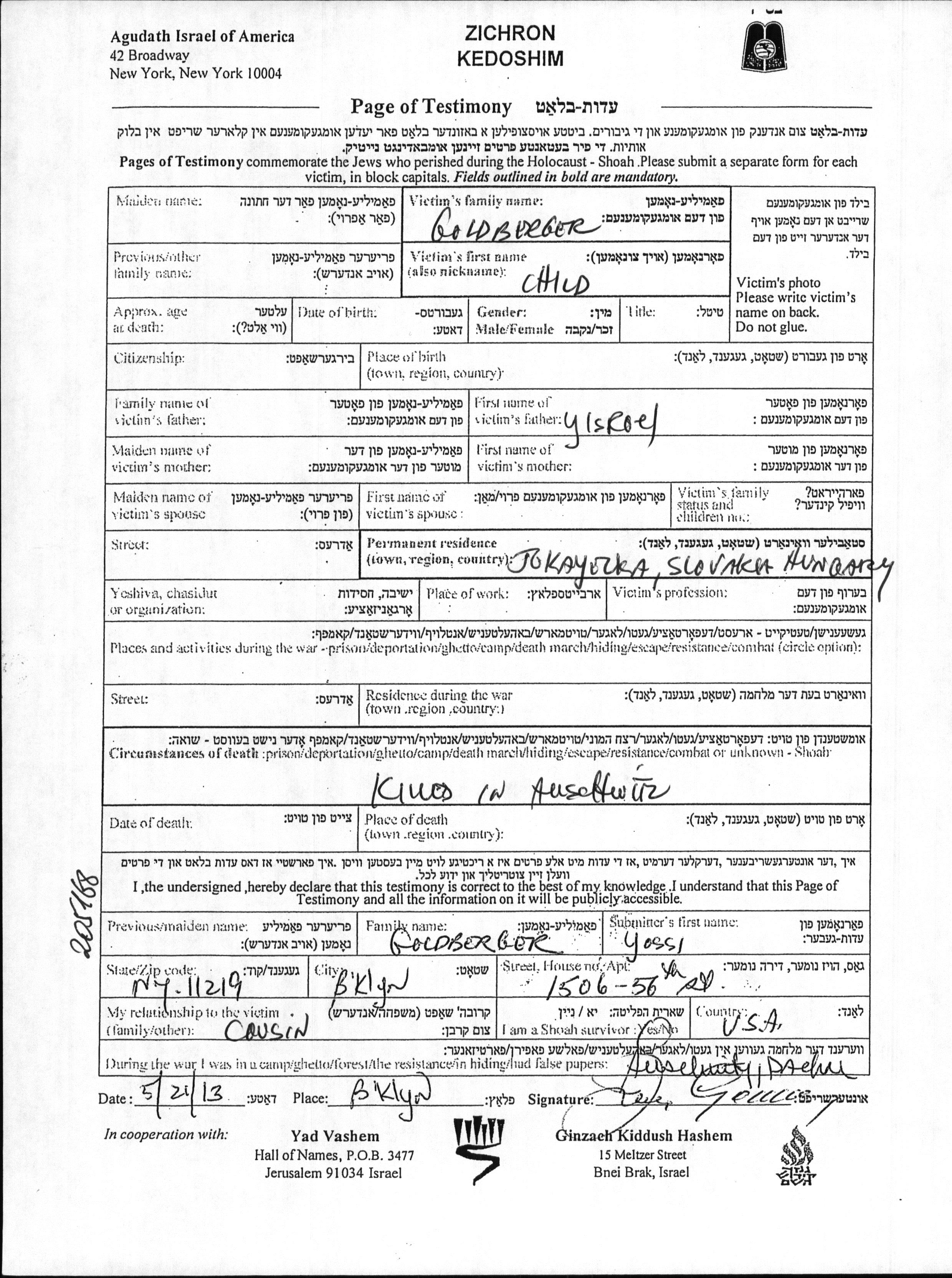 Гольдбергер Имя неизвестно Йока, Чехословакия Лист свидетельских показаний